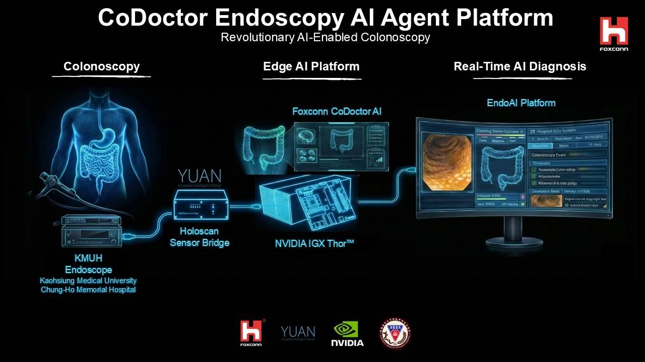 【記者蘇莉湘 / 高雄報導】 台灣癌症時鐘持續快轉,根據衛生福利部111年資料顯示,每4分就有1人罹癌,其中位居前二名的大腸癌,確診的黃金標準是使用大腸鏡檢查(全大腸內視鏡檢查),醫師會直接觀察病灶並切片病理檢查,其診斷關鍵高度仰賴內視鏡檢查的精準度。為讓AI人工智慧成為臨床決策的即時助手,高雄醫學大學附設中和紀念醫院(以下簡稱高醫)與鴻海科技集團(以下簡稱鴻海)共同攜手合作,打造出一套先進的智慧內視鏡解決方案。其中,「大腸鏡 AIAgent」採用 NVIDIA IGX Thor 工業級平台,是目前全球領先的系統之一,也象徵智慧醫療發展的重要里程碑。該系統在近期落幕的 NVIDIA GTC 2026 上吸引全球關注,成功將台灣的智慧醫療技術推向國際頂尖舞台。