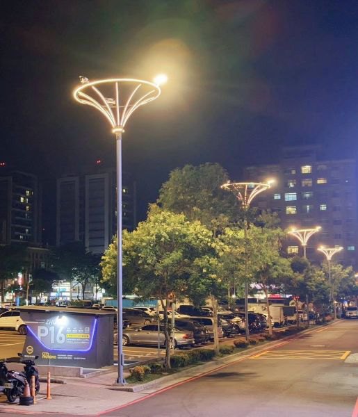 市長鄭朝方說,P16停車場自113年底完成空間改善後,車位使用率顯著提升。然而,停車場對面原有的家樂福商場在停止營業後,過去勉強能提供照明的招牌燈隨之熄滅,使得該處夜間視覺更顯幽暗,視線死角也隨之增加,為了補足這塊關鍵的夜間照明拼圖,市公所自籌156萬元進行優化,特別規劃設置7盞申請專利中的「自由之花」,跳脫傳統制式燈具,將實用功能與城市美學完美結合,讓停車環境從此告別冰冷。