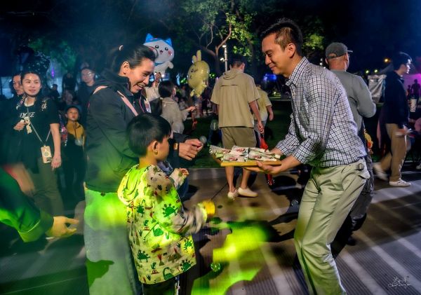 ,他看到孩子們在樹怪森林探險、認真尋找藏在大樹裡的秘密,以及在小火車、飛行船、球池與草上滾筒等設施排隊的滿足笑臉,所有的籌備辛苦都值得了,公園周邊的市集生意更是火爆,不少店家商品被掃貨一空,不到六點早早就掛出「完售」招牌。