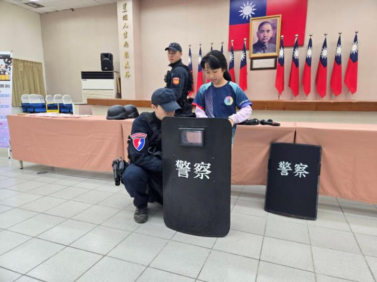 在「警察裝備體驗」單元中,教官介紹各項警用裝備,並讓學生近距離體驗防彈衣、防彈頭盔及防彈盾牌重量
