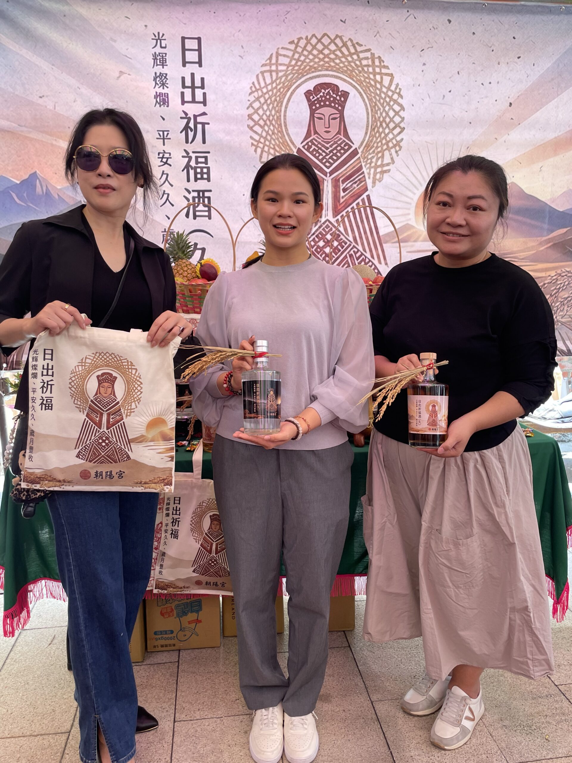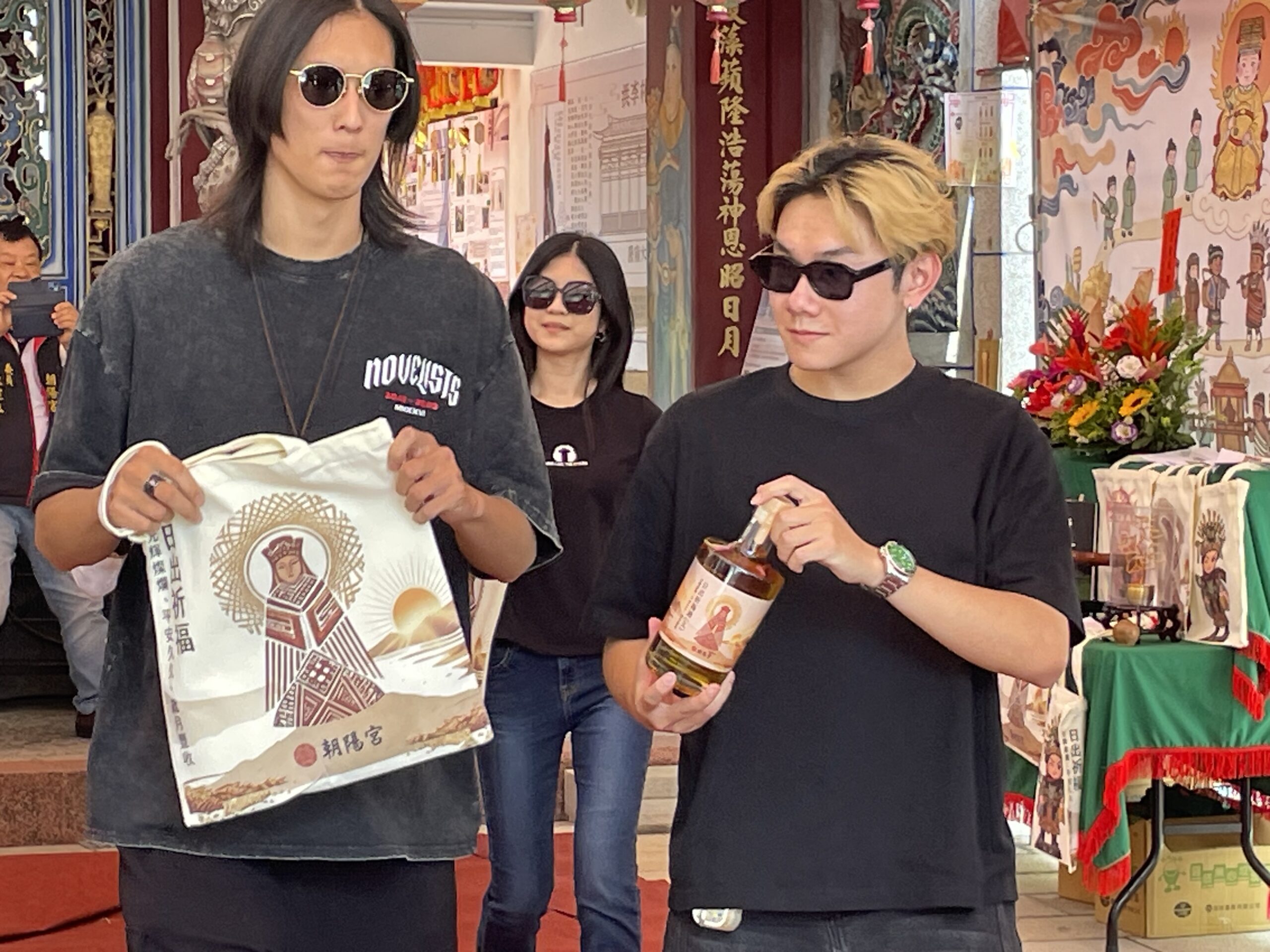 雙胞胎嚴莘慈(左)手持文創媽祖帆布袋、嚴莘瑜(右)手持日出祈福酒走秀。