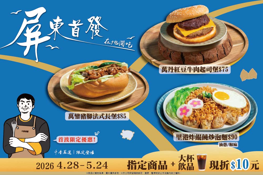 首波主打三大亮點商品,將在地經典轉化為全新吃法。首先是「萬巒豬腳法式長堡」,將熟悉的萬巒風味重新詮釋,滷香濃郁、口感Q彈的豬腳,搭配外酥內軟的法式長堡,一口咬下鹹香層層堆疊,帶來十足滿足感;創新登場的「萬丹紅豆牛肉起司堡」,以綿密紅豆融合鹹香牛肉與濃郁起司,甜鹹交織出獨特層次,打造讓人一試難忘的新組合;而話題感十足的「里港炸餛飩炒泡麵」,推出椒麻與油蔥兩款口味,前者麻香帶勁、層次鮮明,後者鹹香順口、經典耐吃,不只好吃,更讓人留下深刻記憶。
