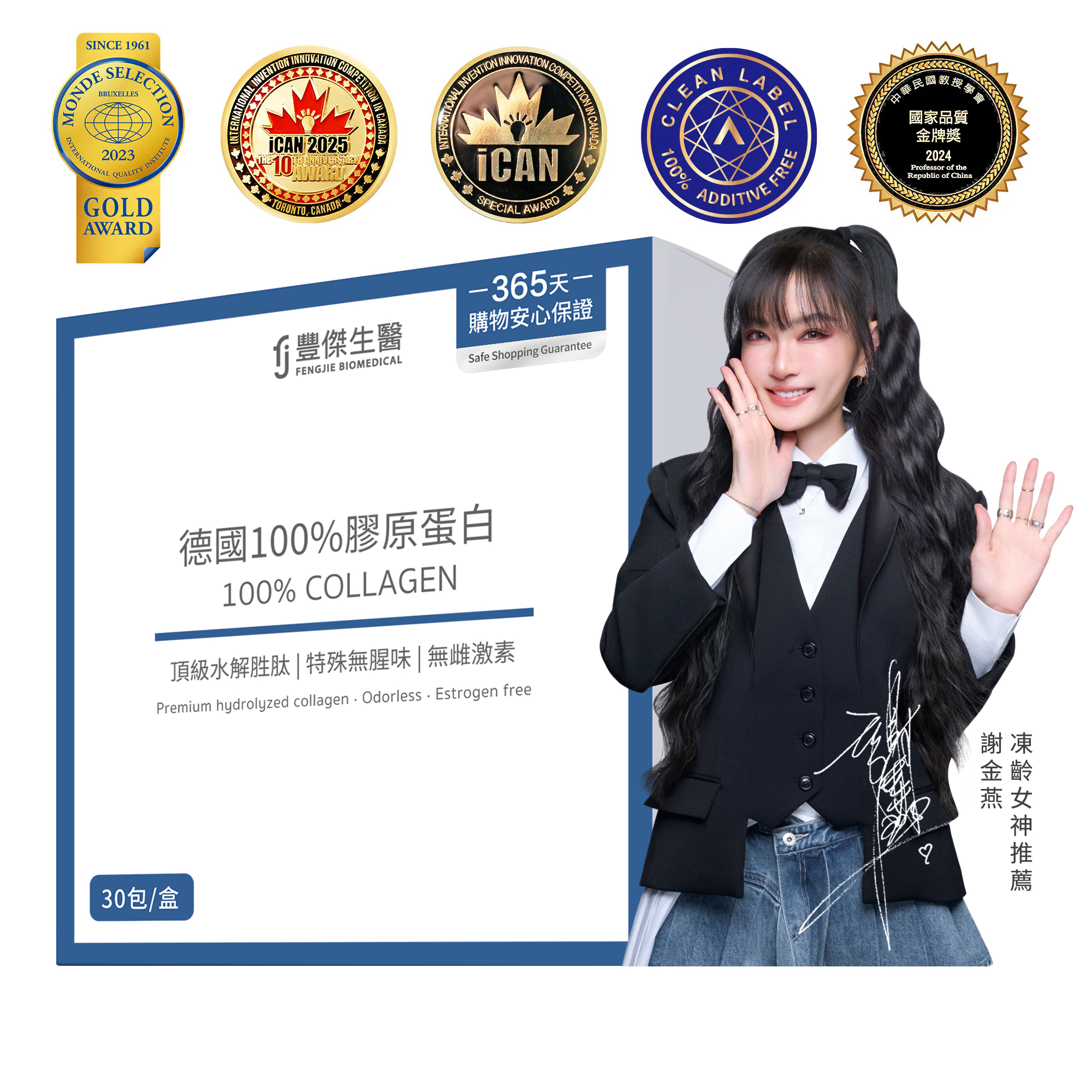 豐傑生醫是台灣專業的保健、保養研發品牌,由專業營養師與研發團隊攜手打造,致力於研發天然植萃保健品。堅持以「品質安心、專業安心、購物安心」三大承諾,用心打造每一款產品。旗下明星商品「豐傑 100% 膠原蛋白」深獲代言人「國民姐姐」謝金燕的高度認可與極力推薦,以極致純粹的品質,成為萬千女性心中不可替代的養顏美容聖品。