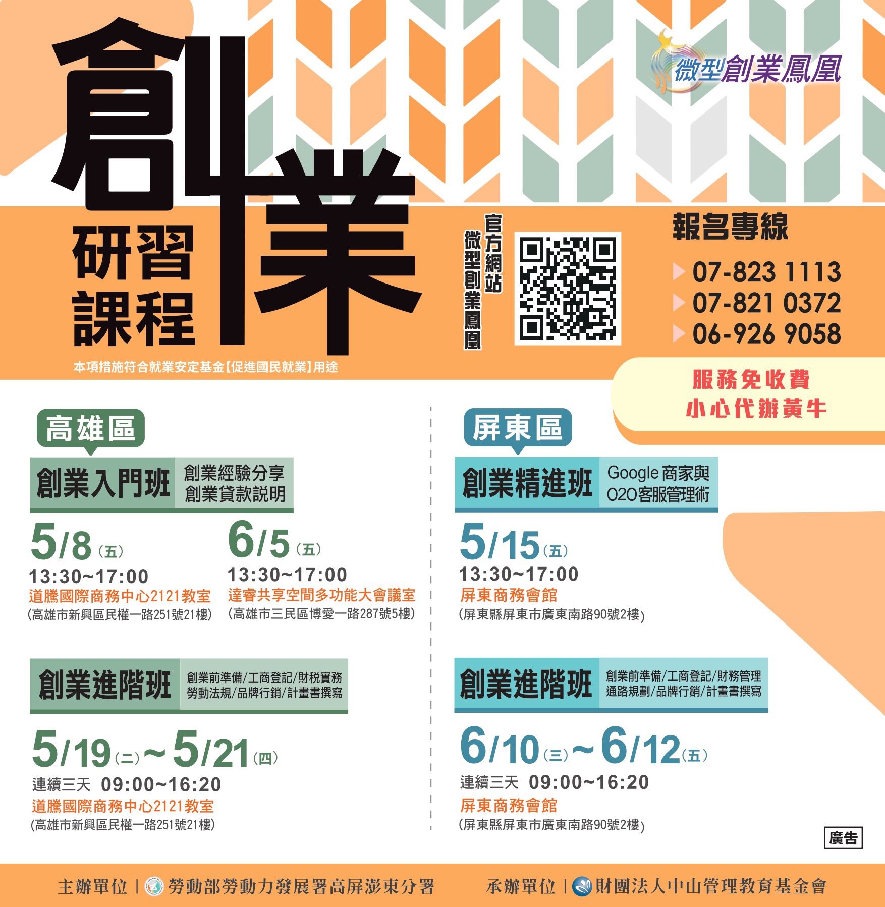 高分署為提供創業民眾更穩健的經營基石,於今年5至6月將在高雄與屏東密集開課,針對尚在觀望、缺乏實務經驗的初創者,可報名參加5月8日、6月5日高雄場入門班,除了邀請獲貸店家分享實戰心得,並由專業顧問解析貸款成功的核心要件。若欲進一步鞏固與強化經營知能,5月19日至21日高雄場、6月10日至12日屏東場辦理為期3天的創業進階班,深度探討品牌行銷、財稅法規、勞動知識及計畫書撰寫等專業主題。此外,針對穩定經營並力求優化管理的創業者,5月15日屏東場精進班則聚焦網路店家經營及顧客管理,學習運用AI工具精準回應評論,將數位危機化為經營轉機,多元課程歡迎有興趣的民眾踴躍報名參加。