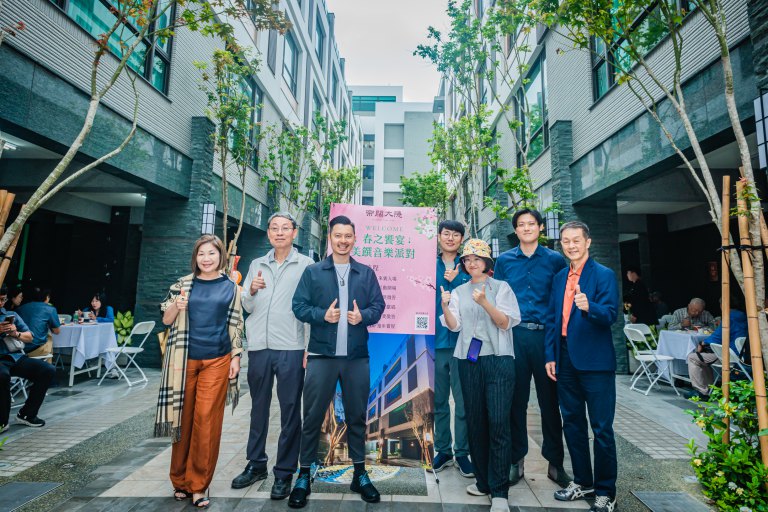 ▲帝闊大隱舉行春之饗宴音樂派對,右起銷售團隊王英吉總經理、建築師團隊、羅時儒協理、劉峻彰建築師、張玉梅董事長於活動上合影。(圖/帝闊建設提供)