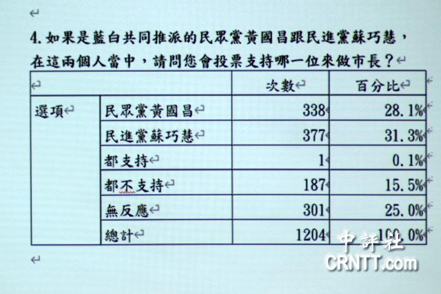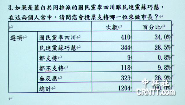 | 綜合報導/中國國民黨和台灣民眾黨今天下午針對新北市長人選民調,共同召開記者會公布結果,最終由國民黨的參選人李四川勝出。在對比式民調中,李四川支持度34.0%贏過民進黨參選人蘇巧慧28.5%,民眾黨的黃國昌則以28.1%輸給蘇巧慧的31.3%,因此由李四川勝出。
