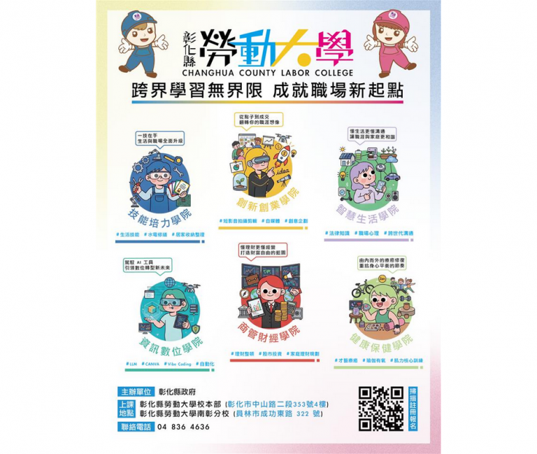 彰化縣政府為提升勞工職能、促進終身學習,推動「彰化縣勞動大學」,將於5月1日勞動節正式營運並開放報名,30日舉行啟動記者會,縣長王惠美表示,勞動大學校本部設於彰化縣農會大樓4樓,南彰分校設於員林市。今(115)年開設超過30門專業課程,搭配56堂DIY紓壓及運動課程,課程以每小時60元計費,第1年首辦推出課程全面5折優惠,最低每小時30元,針對獨力負擔家計者、中高齡之失業者等學員提供全額補助,未來將持續拓展學習據點,邀請縣內勞工朋友,一起加入勞動大學的行列,投資自己為職涯加分。