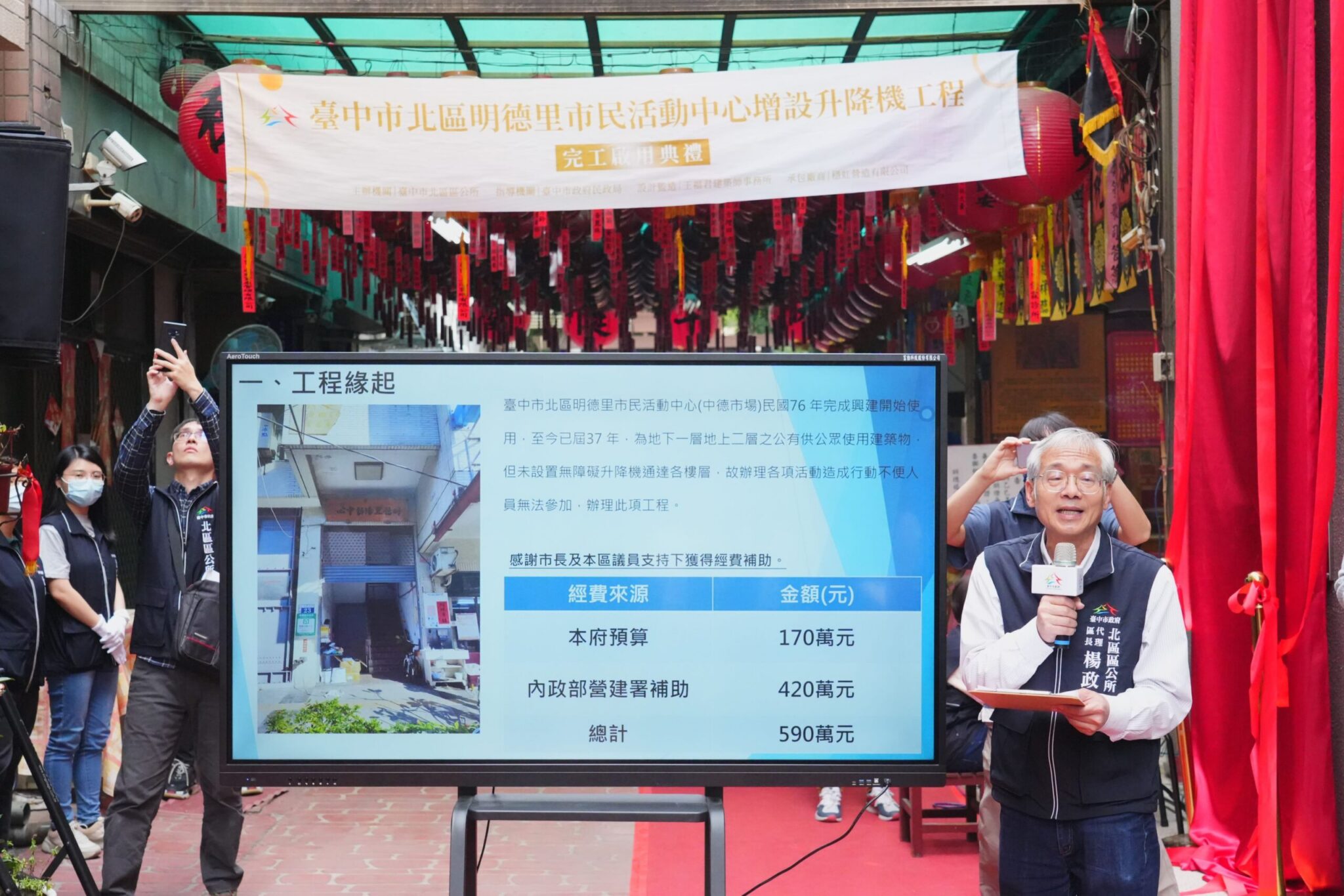 吳局長指出,明德里活動中心位於中德市場2樓,啟用迄今已逾37年,是地方重要的活動聚會處所,因中德市場未設置電梯,且既有樓梯坡度陡峭,年長及行動不便者出入不便,考量民眾使用安全及提升活動中心使用率,市府積極籌措經費130萬元進行規劃設計,加上公所自籌40萬元,並爭取內政部補助420萬元,共投入590萬元,進行無障礙電梯增設及公廁改善等,讓北區在地居民擁有更優質的活動空間。