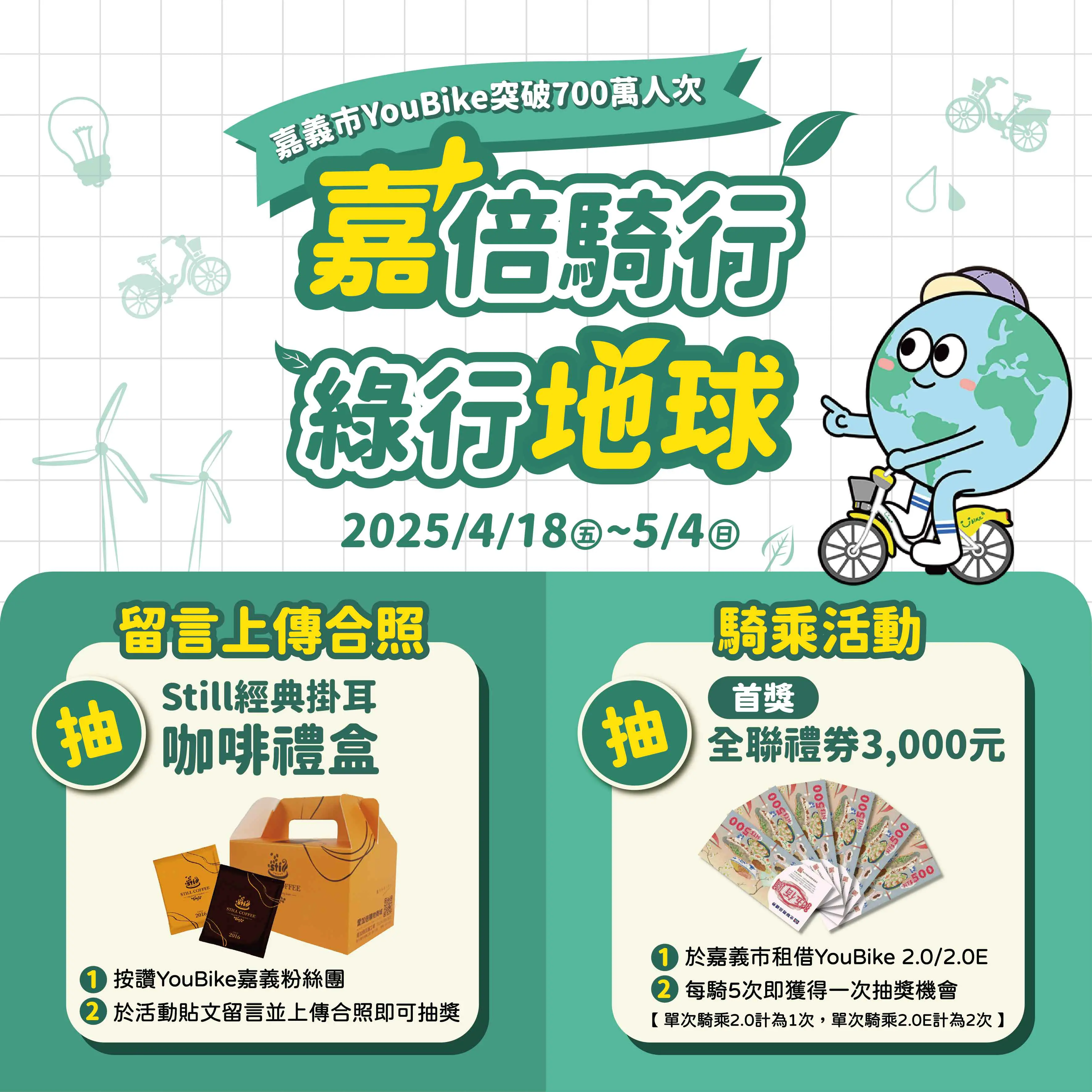 嘉義市公共自行車系統自109年啟用,不僅深受市民喜愛,更已成為綠色交通的象徵與驕傲。嘉義市YouBike的累計騎乘人次於114年4月11日正式突破700萬人次!市府與微笑單車公司為歡慶嘉義市突破700萬騎乘人次,舉辦「嘉倍騎行,綠行地球」系列活動,4月18日起至5月4日期間內,至臉書YouBike嘉義粉絲團活動貼文完成指定任務,即可參加抽獎!另為響應世界地球日還加碼舉辦「騎乘抽獎活動」活動,騎乘YouBike即有機會抽中好禮!邀請民眾一起用騎行守護地球,為綠意出一份力!