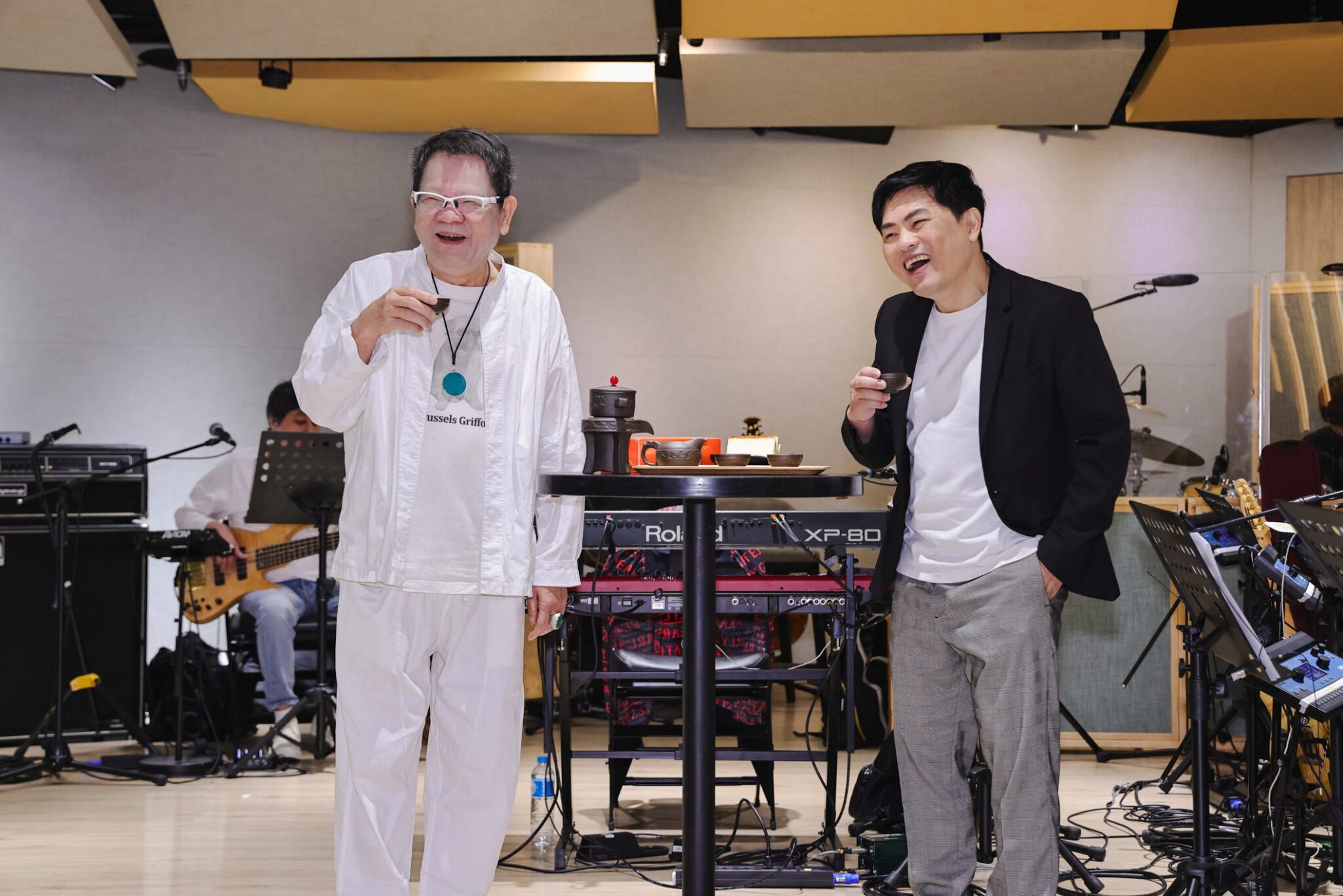 彩排中,鄭進一與蘇明淵分別演唱代表作,展現對音樂創作的熱情與金曲的傳承精神。兩人互動溫暖有趣,蘇明淵特地帶來高雄鹽埕知名蜂蜜蛋糕與「一哥」分享,祝福對方「吃甜甜、唱好歌」。鄭進一則回贈巨型鋼筆,象徵祝福身兼律師與音樂人的蘇明淵,無論是寫詞、寫歌還是寫訴狀,都能「筆走龍蛇、替天行道」,寓意深遠,傳承意義濃厚。