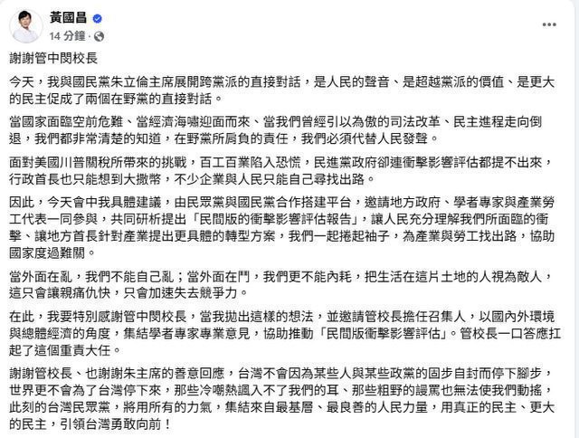 中評社台北4月22日電/中國國民黨主席朱立倫及台灣民眾黨主席黃國昌今日進行峰會,針對美國總統川普的高關稅政策,黃國昌提議國、民兩黨推出民間版本的衝擊影響評估,並由前台大校長管中閔來運作。會後,黃國昌隨即在臉書發文表示,感謝管中閔校長,當他拋出這樣的想法,並邀請管校長擔任召集人,管校長一口答應扛起了這個重責大任。 黃國昌說,謝謝管中閔校長、也謝謝朱立倫的善意回應,台灣不會因為某些人與某些政黨的固步自封而停下腳步,世界更不會為了台灣停下來,那些冷嘲熱諷入不了我們的耳、那些粗野的謾罵也無法使我們動搖,此刻的台灣民眾黨,將用所有的力氣,集結來自最基層、最良善的人民力量,用真正的民主、更大的民主,引領台灣勇敢向前! 黃國昌表示,今天他與國民黨主席朱立倫展開跨黨派的直接對話,是人民的聲音、是超越黨派的價值、是更大的民主促成了兩個在野黨的直接對話。 黃國昌指出,當國家面臨空前危難、當經濟海嘯迎面而來、當我們曾經引以為傲的司法改革、民主進程走向倒退,我們都非常清楚的知道,在野黨所肩負的責任,我們必須代替人民發聲。面對美國川普關稅所帶來的挑戰,百工百業陷入恐慌,民進黨政府卻連衝擊影響評估都提不出來,行政首長也只能想到大撒幣,不少企業與人民只能自己尋找出路。 黃國昌說,因此,今天會中他具體建議,由民眾黨與國民黨合作搭建平台,邀請地方政府、學者專家與產業勞工代表一同參與,共同研析提出“民間版的衝擊影響評估報告”,讓人民充分理解我們所面臨的衝擊、讓地方首長針對產業提出更具體的轉型方案,我們一起捲起袖子,為產業與勞工找出路,協助國家度過難關。 黃國昌強調,當外面在亂,我們不能自己亂;當外面在鬥,我們更不能內耗,把生活在這片土地的人視為敵人,這只會讓親痛仇快,只會加速失去競爭力。 黃國昌表示,在此,我要特別感謝管中閔校長,當他拋出這樣的想法,並邀請管校長擔任召集人,以國內外環境與總體經濟的角度,集結學者專家專業意見,協助推動“民間版衝擊影響評估”。管校長一口答應扛起了這個重責大任。