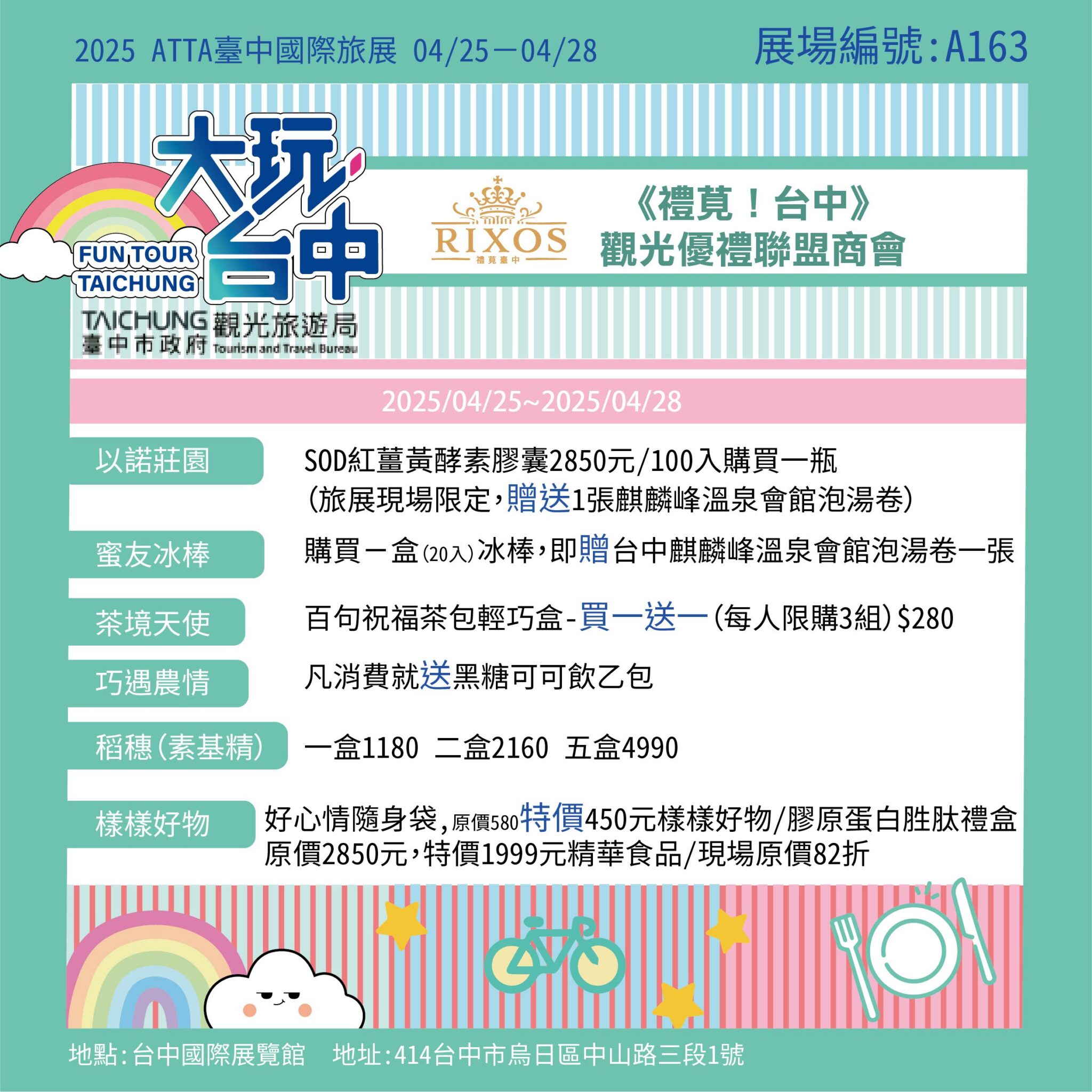 此次旅展有多家台中市優質公協會及業者合力展攤,其中台中市好禮協會聯合6家業者,分別在4天展期推出不同優惠:木筆家(4/25)推出樹枝永恆筆買1送1;楽澗(4/25)祭出旅展現場3折起優惠再買1送1;PINTRUE品醋迷(4/26)購買不限金額,即送1瓶50ml(價值239元)限量50瓶送完為止;廣記肉鬆(4/26) 祭出原味肉鬆,特價100元(原價120元,限量10包)賣完為止;埕憶送禮(4/27) 法式雪雲千層派與餡餡蛋捲,特價350元(原價400元);點點狐(4/28) 【探險家隨行瓶】30ml優惠價299元(原價370元)。台中市糕餅商業同業公會共有4家業者參展,好禮老東家招牌雞腳凍買1袋(5包)送1袋(5包);熊介巧商品買1送1;芋樂大世界買千送贈品。眾多商品超優惠,民眾千萬別錯過。