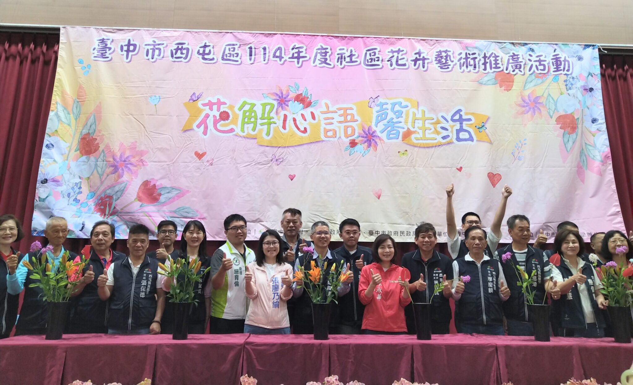 西屯區長鄭錫禧說明,西屯區公所自100年起迄今已連續15年於母親節期間辦理花藝推廣活動,民眾參與踴躍、反應熱絡,活動邀請專業花藝老師教授插花技巧,初學者也能輕鬆上手,希望藉此讓更多的民眾喜愛國產花卉,協助在地花卉產業行銷。