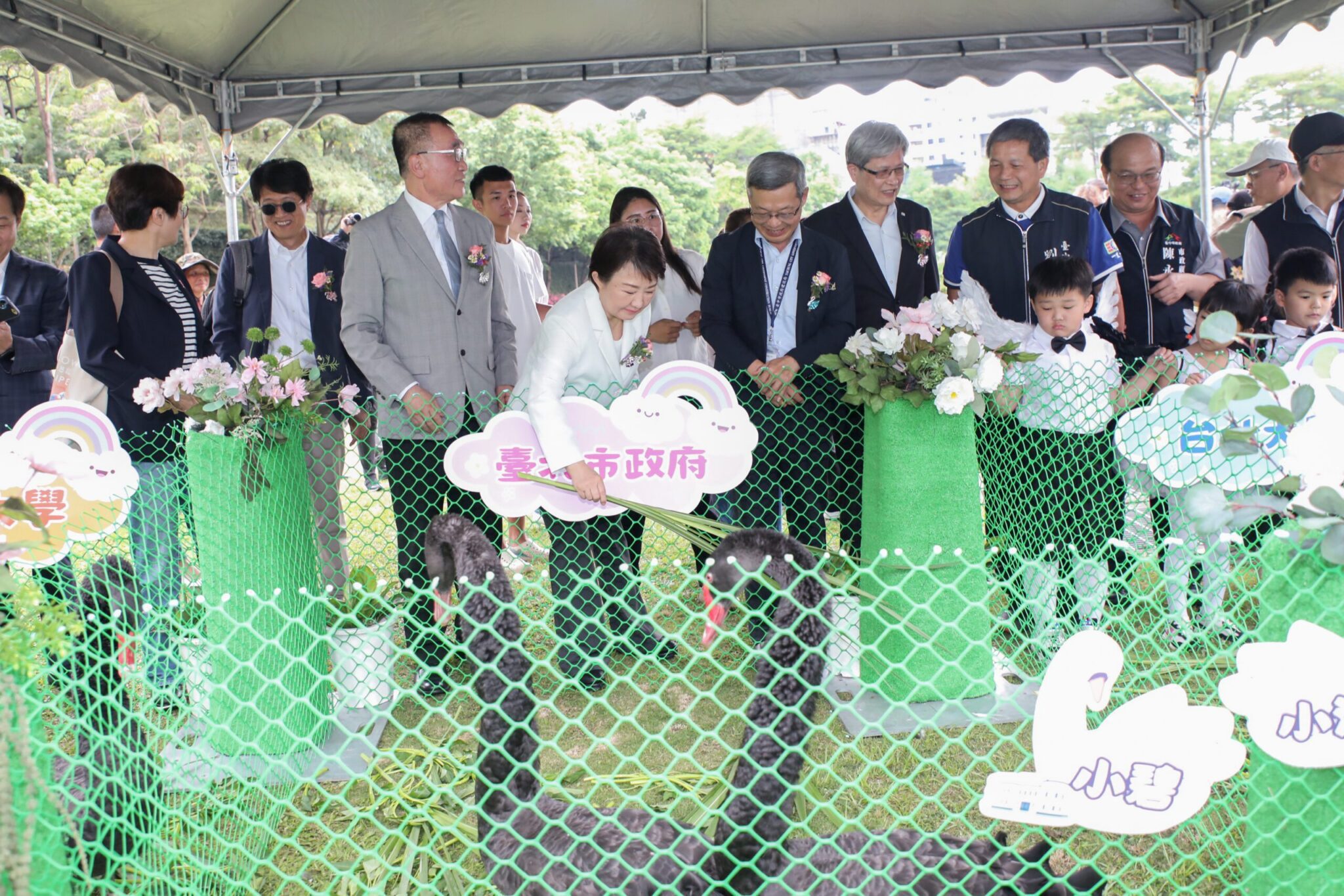 盧市長表示,台中市近年人丁與動物皆興旺,自兩年前首批黑天鵝入住秋紅谷以來,園區陸續成功孵化出多隻鵝寶寶,如今黑天鵝家族已壯大至15隻。為讓這些「鵝」子、女「鵝」有更好的成長環境,中市府今日與台北市政府、台北大學、東海大學正式「結為親家」,三方皆在動物保育與生態教育上表現優異,市府對此次合作深感放心,也相信未來彼此會因「鵝」子、女「鵝」建立更密切的互動。她也盼他們在新家健康成長,繼續孕育更多生命,並推動生態保育向下扎根。