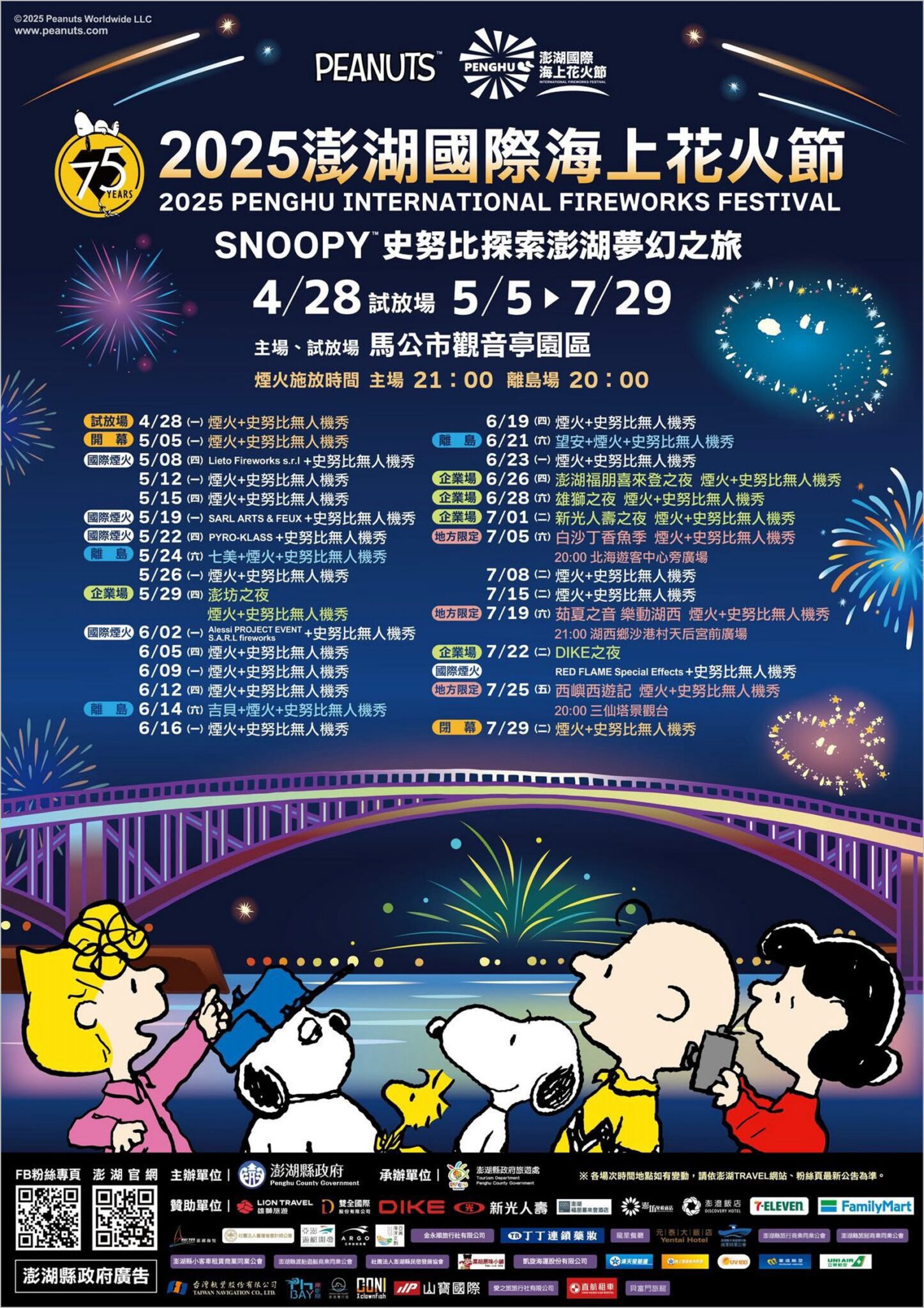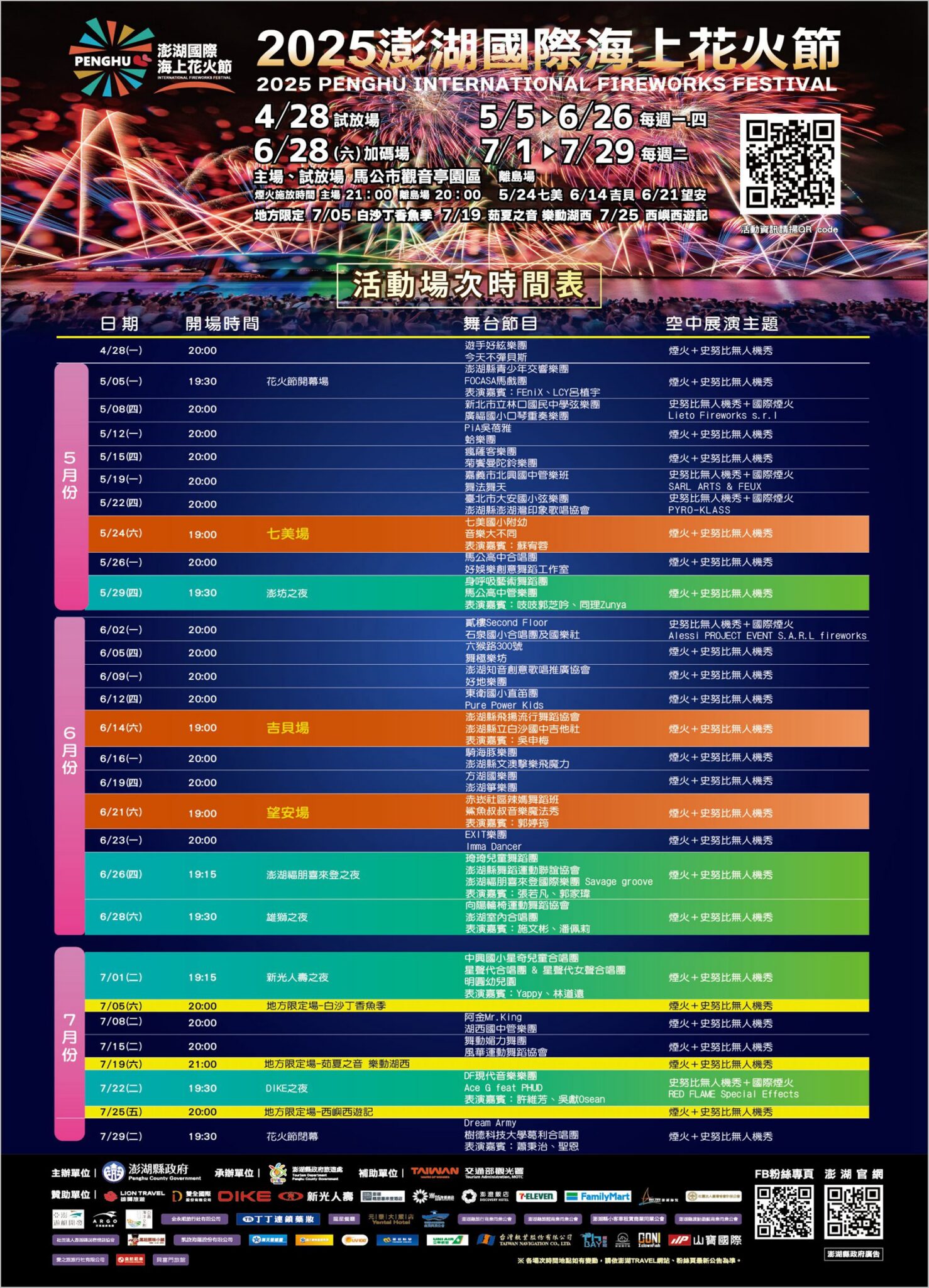 除了旅展現場精采可期,今年澎湖夏天的重頭戲也不容錯過!2025澎湖國際海上花火節場場都有絢麗煙火與炫目無人機秀,將澎湖的夜空妝點成最動人的浪漫舞台,讓每一場都成為永生難忘的回憶。煙火與無人機展演時間為主場每晚21:00(離島場為20:00),主場地點位於馬公市觀音亭園區,將於4月28日辦理試放場,5月5日開幕至6月26日每週一、四,其中,6月28日(週六)企業主題加碼場,7月1日至29日為每週二,離島場為5月24日七美、6月14日吉貝、6月21日望安,地方特色場配合在地特色活動,則有7月5日白沙丁香魚季、7月19日茹夏之音・樂動湖西,以及7月25日的西嶼西遊記,共計29場次。