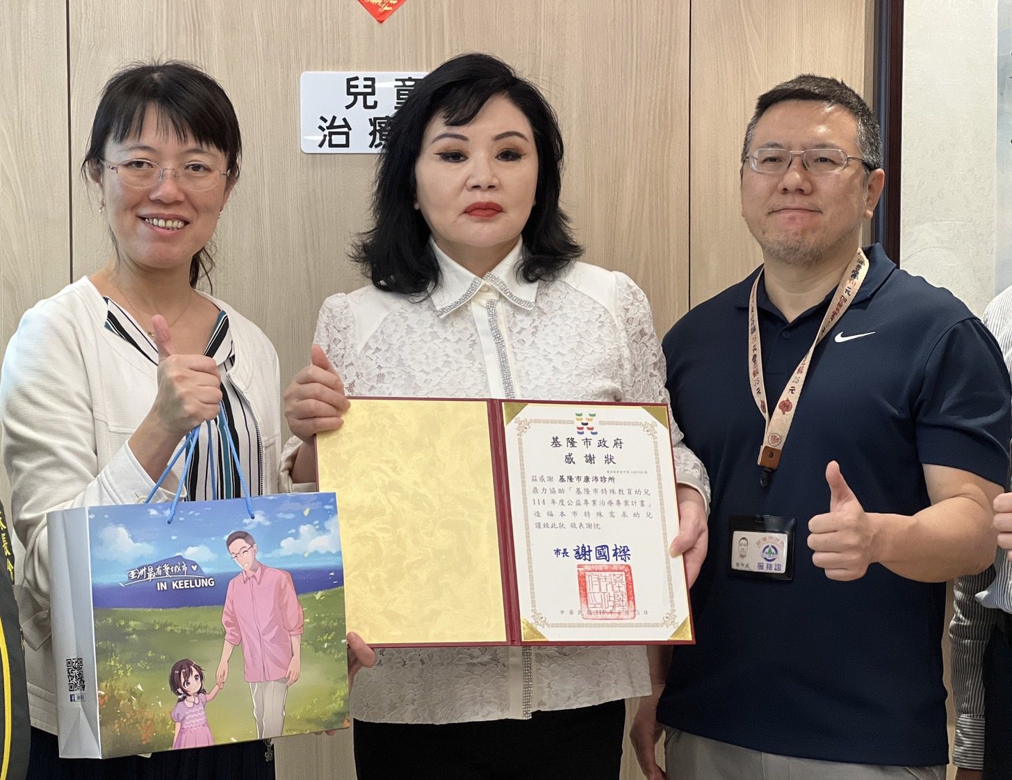 隨著特殊教育的需求日益增加,基隆市政府積極開拓多樣化的服務方式,為了提供本市特殊教育需求幼兒更完善的發展支持,基隆市政府教育處攜手基隆康沛診所,共同推動「基隆市特殊教育幼兒114年度公益專業治療專案計畫」。期待透過計畫全額補助專業治療服務,不但能減輕弱勢家庭的經濟負擔,更能確保特殊幼兒獲得適切的早期療育與發展機會,教育處副處長楊永芬29日特別至診所關心上課幼生並致贈基隆康沛診所總裁白右筠感謝狀。