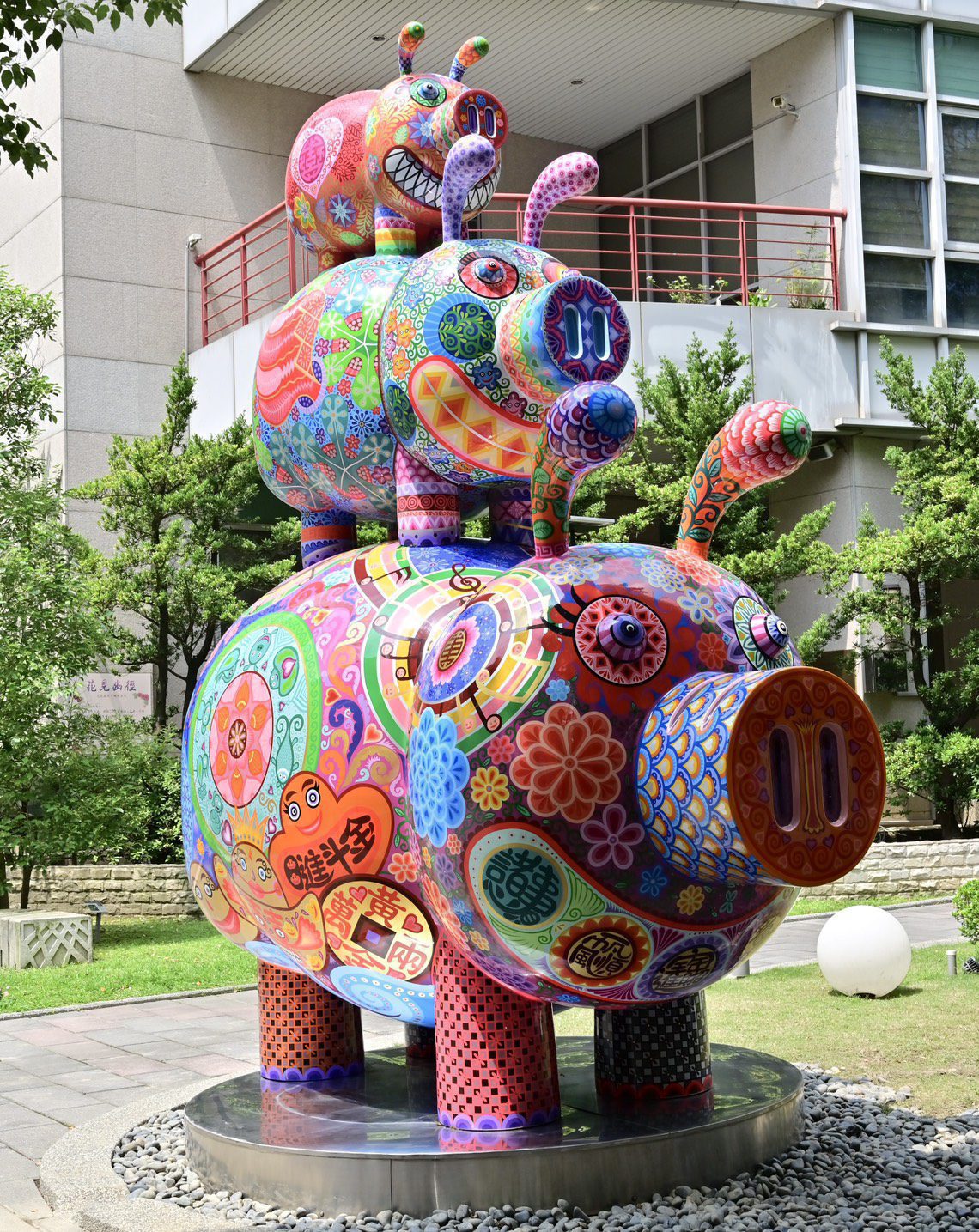 洪易大師說,此次展出作品,是以三隻風格鮮明的小豬,傳達「三陽開泰」、「團圓喜氣」的意象,融合台灣民俗意涵與現代雕塑風格。作品長335公分、寬175公分、高388公分、重達892公斤,色彩繽紛、造型活潑,搭配地稅局前庭的綠意盎然,格外吸睛,為公共空間注入生命與趣味,也激發市民對生活的美好想像。