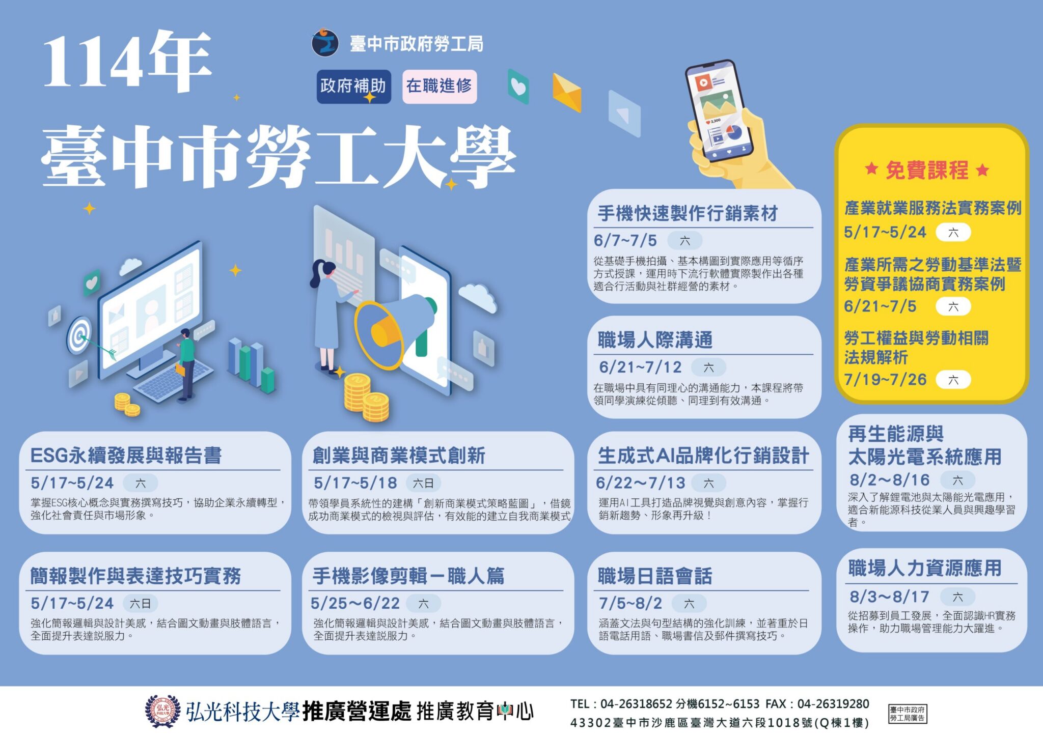 「台中有勞大,職場沒在怕!」勞工局表示,歡迎設籍台中或於台中工作的在職勞工運用勞工大學各項資源提升自我並增強職場競爭力,讓勞工大學成為勞工朋友提升職場競爭力的靠山!更多勞工大學課程、講座及報名資訊可至官方網站查詢(https://laborlearn.taichung.gov.tw/course.php)