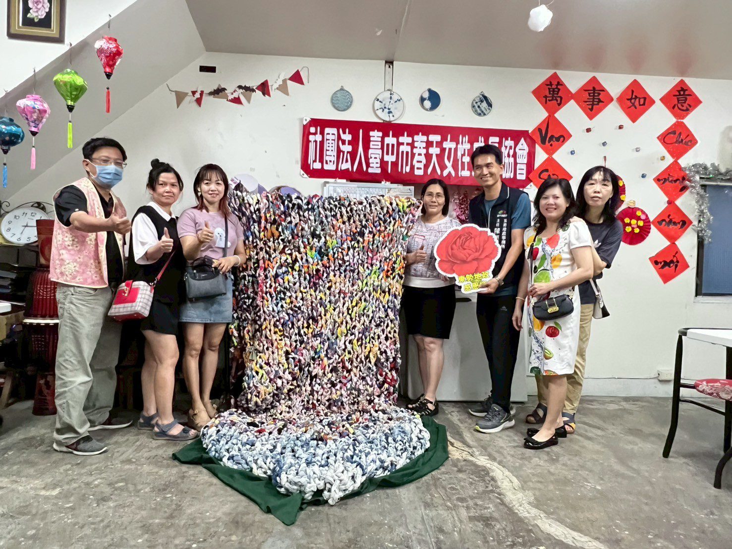 此外,新住民為紀念921地震,與東勢居民共同手工編織成一條巨型網狀作品「百納被」,協會理事長阮芳鴛以此比喻共同參與的重要性,期許由新住民協助政府與居民結網連心建構性別平權的橋樑,共同為維護不動產權益而努力。