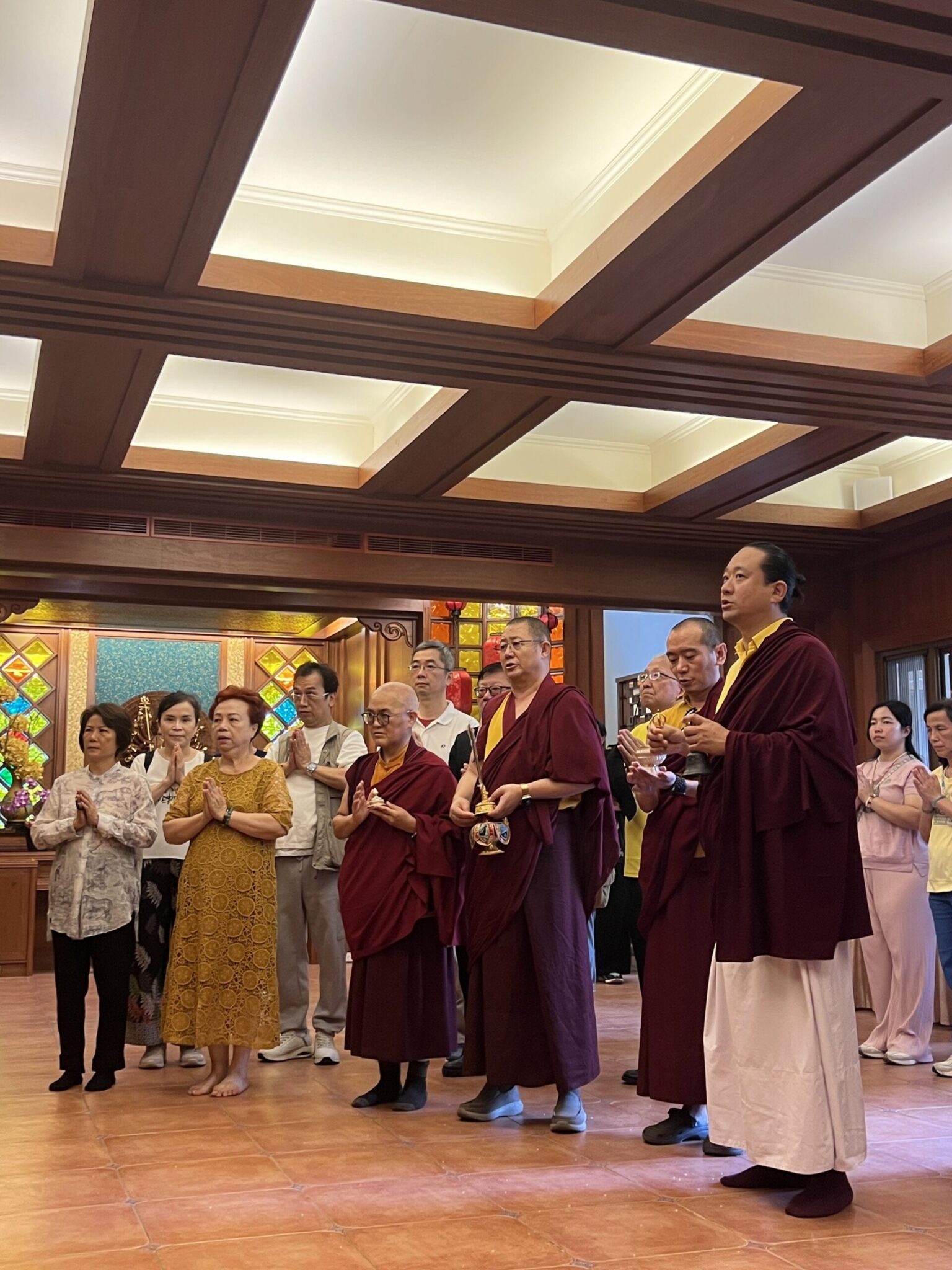 此次水供法會依藏傳佛教傳統儀軌舉行,信眾將鮮花、牛奶、香草、乳香、與食子等潔淨供物,投入由金龍環繞的供水壇中。法王帶領眾僧誦經灑淨、敬供龍王,為台灣祈願風調雨順、人民安樂。