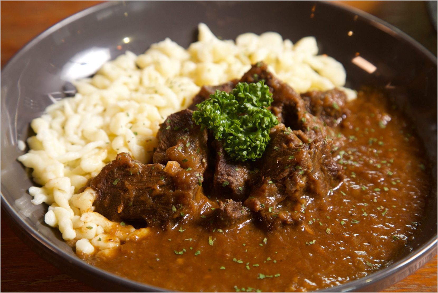 再來一盤【奧地利燉牛肉佐麵疙瘩】,牛肉慢火燉到入口即化,配上手工麵疙瘩,讓你瞬間穿越到老維也納的老街裡,一邊吃、一邊哼圓舞曲。