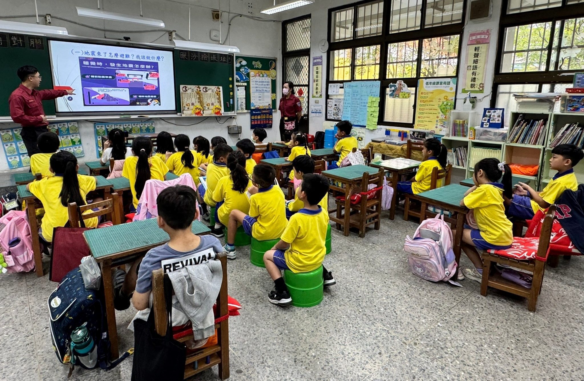 當發現地震搖晃時,第一時間要立即保護好自己。消防人員解說「趴下、掩護、穩住」的防震基本動作,並且現場讓同學實際演練如何快速反應,保護好自己的安全。雖然是簡單的避難動作,但是在地震發生的時候,我們可能會在任何地點,都要能及時找到屏障來防護自己。另外,經常性的進行演練也是確保迅速應變的關鍵。