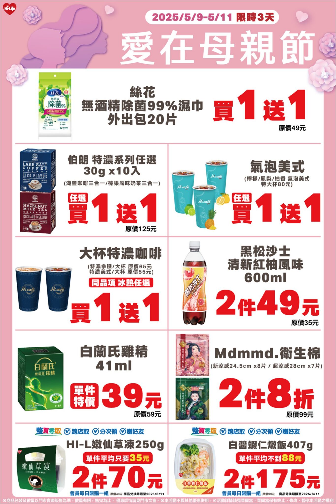 絕不能錯過的Hi café母親節限定優惠來了!**萊爾富嚴選通過CQI評鑑的精品咖啡豆,結合堅果與可可的醇厚風味,採用高海拔產區咖啡豆調製而成,整體咖啡風味全面升級,讓Hi café成為極致享受的代名詞。自5月9日至5月11日限時3天,推出超值咖啡優惠:特大杯氣泡美式(檸檬/鳳梨/柚香,售價80元)買1送1,大杯特濃美式(55元)與大杯特濃拿鐵(65元)同品項不限冰熱也享買1送1,邀您與媽咪一同在巷口萊爾富輕鬆共享濃香好時光。