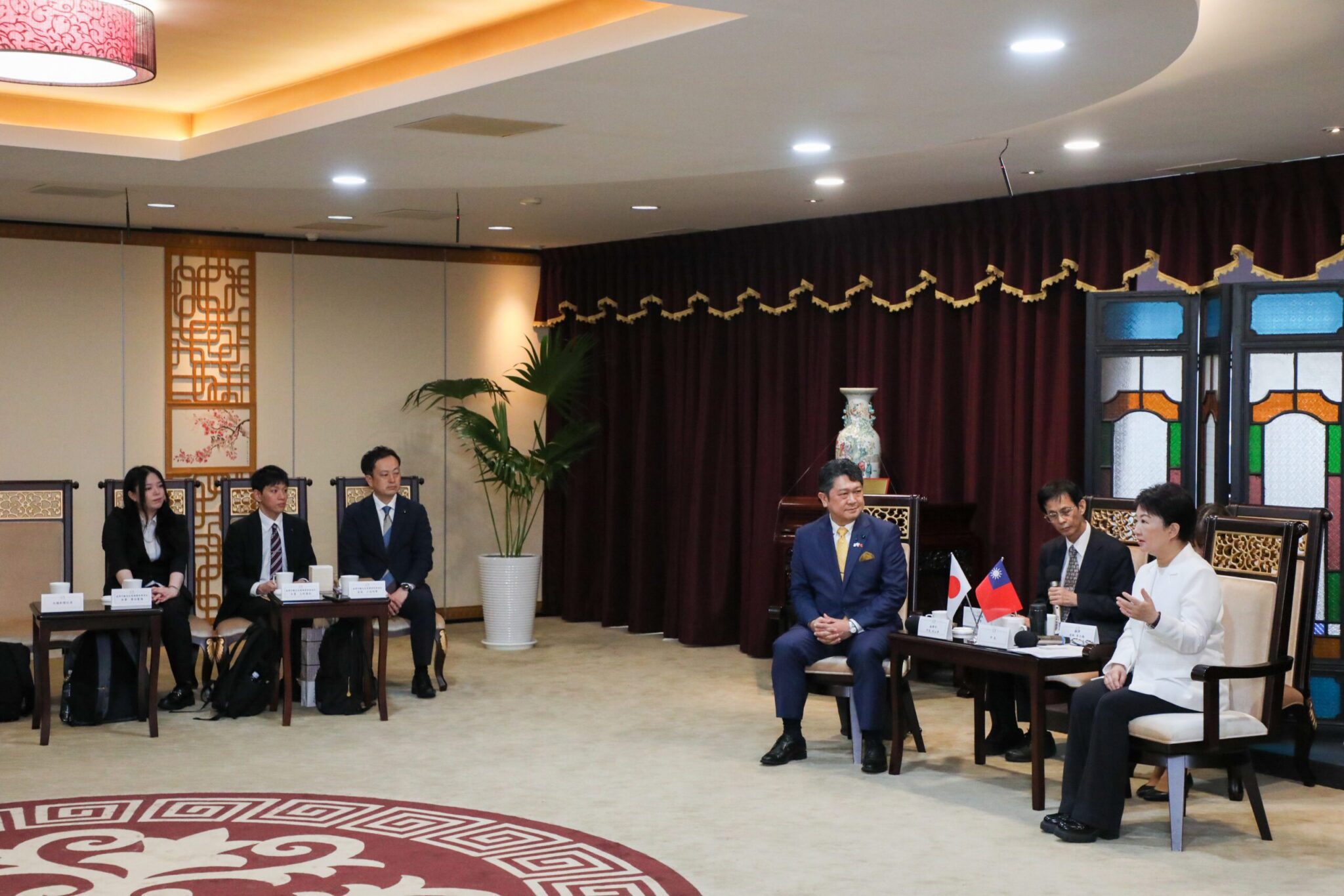 盧市長今日在副市長黃國榮、文化局長陳佳君、觀光旅遊局長陳美秀、水利局長范世億、秘書處長謝佳蓁陪同下,會見日本石川縣金澤市市長村山卓、觀光政策課誘客推進室長小谷內章、主查上村直也、主事粟田夏海等一行人,雙方相談氣氛熱絡。