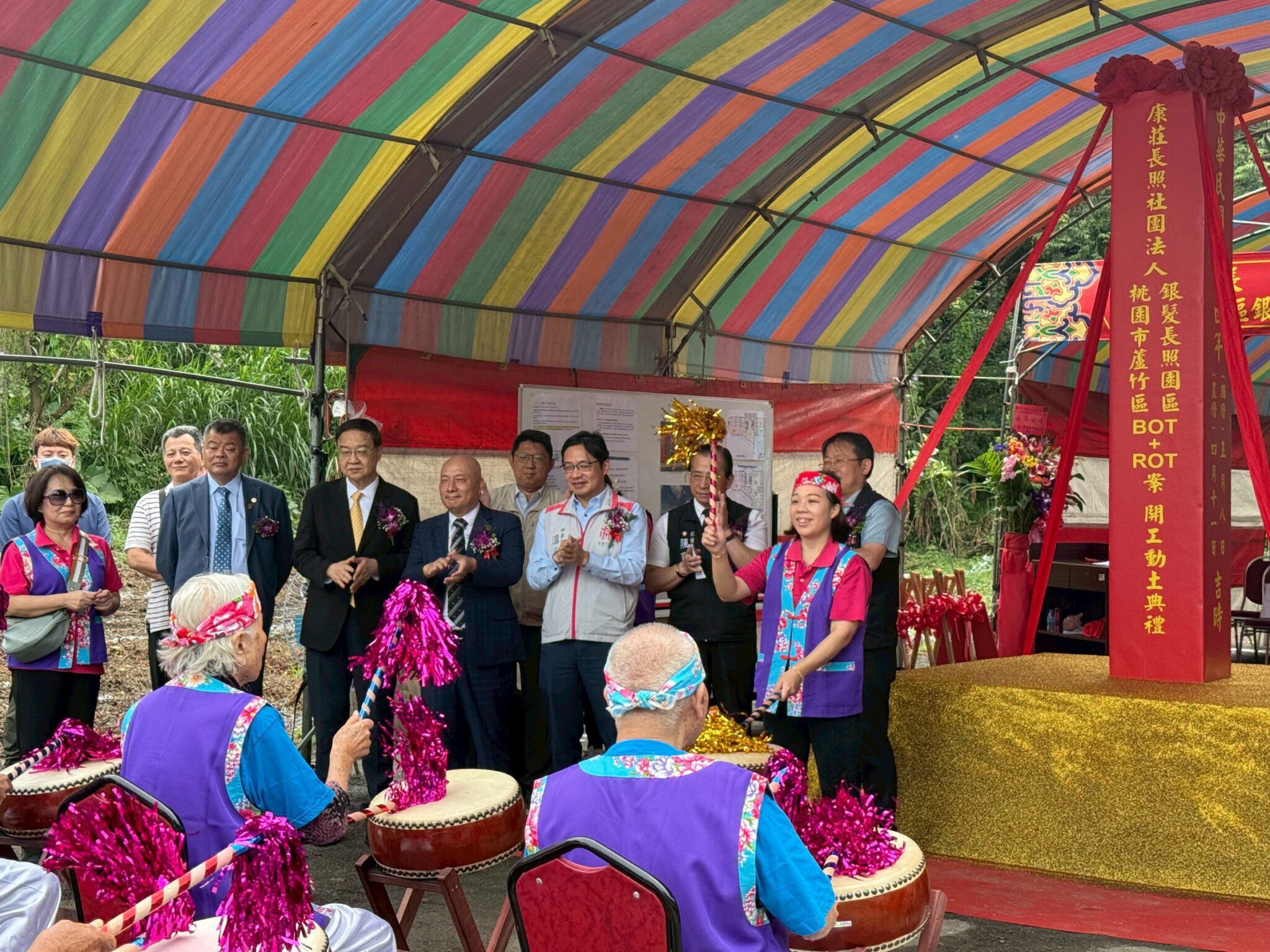 為見證這項重要工程啟動,特邀桃園市秘書長溫代欣、社會局長陳寶民、桃園市社會局老福科科長曹姵妏、蘆竹區區長李岳壇、蘆竹區主秘王靖亮、蘆竹區社會課長謝明儒、山腳里徐慶堂里長、外社里李金灶里長、桃園市幸福基金會董事長王妗濰、中華科技大學副校長李禮仲、財團法人怡德老人長期照護中心董事江彥霆、財團法人怡德老人長期照護中心董事柯慶宗等貴賓蒞臨祝禱,一起持金鏟進行動土儀式,祈願工程圓滿順利,現場熱鬧隆重。