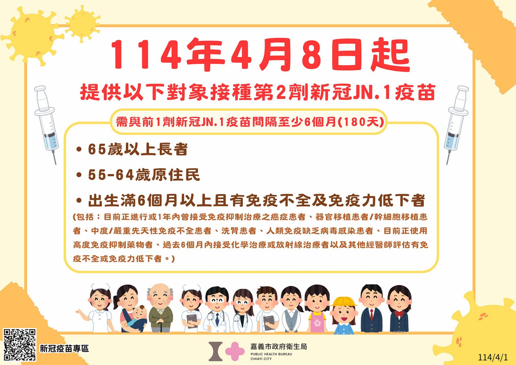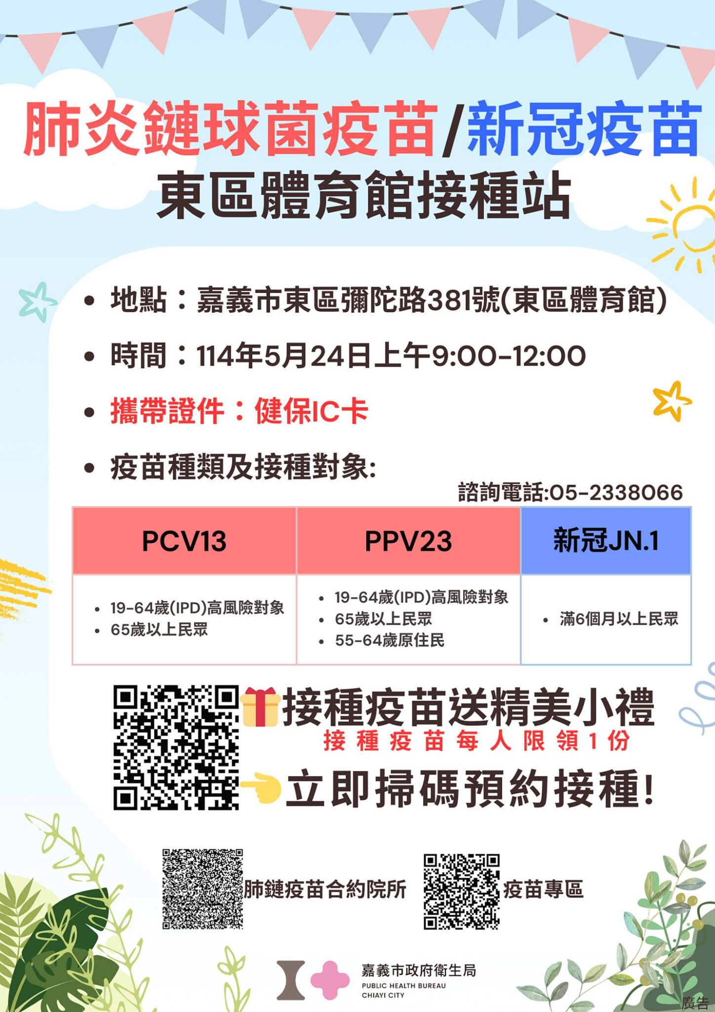 俗稱「老人殺手」的肺炎病例數為近6年來(2020年起)同期新高,另新冠疫情也再度進入流行期,全國新冠門急診就診人次單周增加近8成,已連續四週上升。為守護市民健康,嘉義市政府衛生局超前佈署,於5月24日(六)上午9-12時在東區體育館(嘉義市彌陀路381號)開設肺炎鏈球菌及新冠JN.1疫苗接種站,此場社區接種站採網路預約制,預約網址為https://www.ymhospital.com.tw/nym/ym_pne/ ,請符合接種資格的民眾攜帶健保卡(IPD高風險對象另請攜帶診斷書等相關證明文件)儘速前往接種,以提升免疫保護力,降低重症與死亡發生風險。