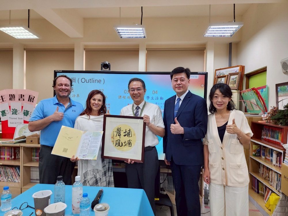 參訪貴賓上午九點半抵達校門口,在古箏社悠揚樂聲與學生熱烈歡迎中展開參訪行程。隨後,在圖書室向貴賓簡介學校發展歷程,分享青埔國小在雙語教育、國際交流與校園美感營造方面的努力與成效,了解青埔國小的教育理念與辦學特色,特別是近年來於學校設施、雙語教學、國際教育、社團活動與在地連結的深耕努力。