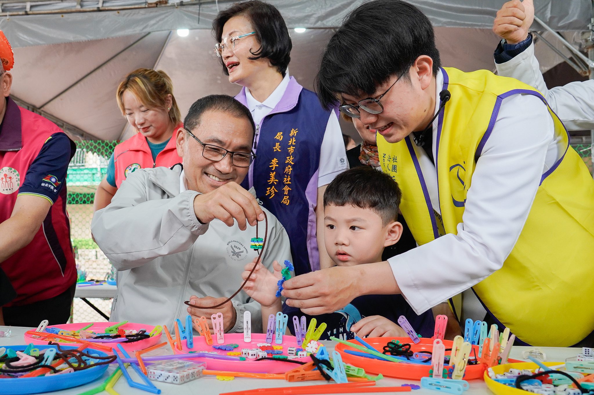 今日登場的兒童安全嘉年華活動,社會局與新北市兒童教保協會攜手,並跨局處及單位合作設攤,從居家、健康安全和交通等面向,透過遊戲闖關及實境模擬體驗,強化孩子在成長階段安全知能,將兒童安全落實生活中。侯友宜也帶著交通和健康安全圖卡,為大小朋友解說安全知能,進行有獎徵答,並與幼兒於攤位體驗區進行早療評估,提醒早期療育的重要性。
