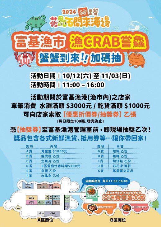 此外,即日起至11/17(日)到富基魚市餐廳品嚐限定料理時,別忘了向餐廳索取「蟹味登機證」小卡,掃描小卡上的QRcode即可線上填寫表單,完成抽獎資料登錄,將於11/18(一)抽出富基魚市「感蟹金」10,000元(共3名)以及物超所值的熟蟹福袋(共10名)。除了品嚐萬里蟹料理,也別忘了把新鮮活海產帶回家,在水攤消費滿3,000元或乾貨攤消費滿1,000元,即可向攤商索取魚市抵用券(每日限量100張,使用期限至113年12月31日)。持抵用券可至活動服務台參加滿額抽「感蟹金」1,000元(可於魚市折抵生鮮萬里蟹消費)、龍虎斑、生魚片、萬里蟹限定禮品或各式海鮮乾貨等好禮。