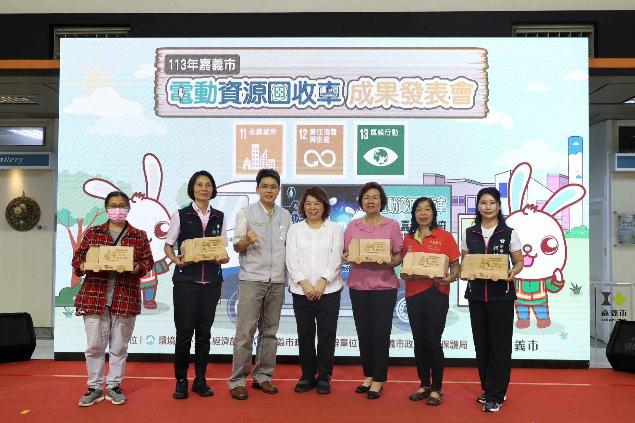 環保局指出,電動資源回收車經試行結果相較燃油車可減少75%碳排放量。以嘉義市40條收運路線為例,每年約可減少碳排放180,960公斤,相當於395.6棵20年生台灣相思樹或62619平方公尺的林地面積之固碳量。另電動資源回收車相較於燃油車,每公里燃料費可節省73.87%,換算全市收運路線每年約可減少46萬元燃料支出。