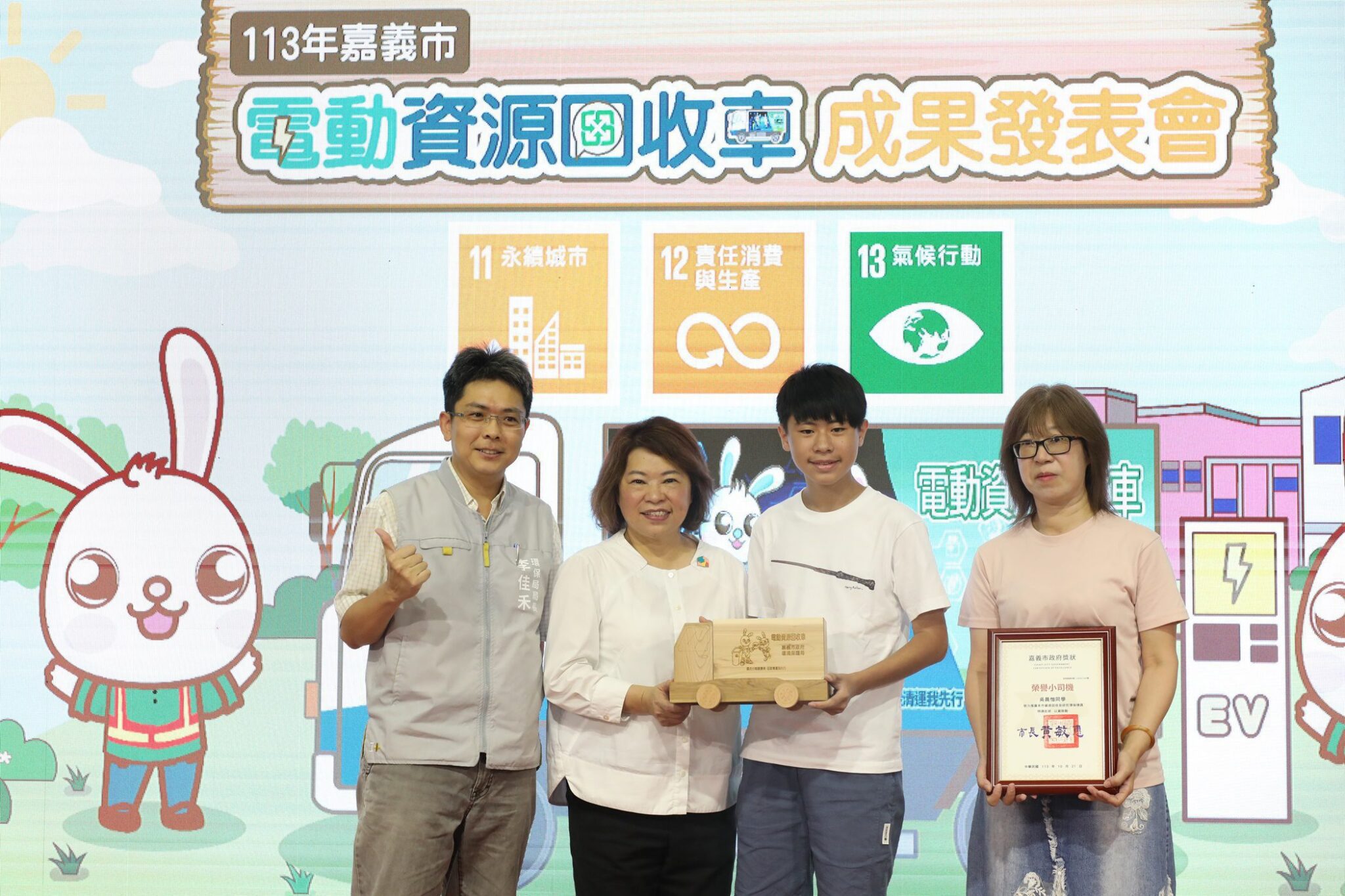 今日黃敏惠也特別頒發獎狀予嘉義市垃圾車達人愷愷同學,愷愷目前就讀蘭潭國中三年級,他跑遍了嘉義市區的每一個角落,記錄著每一條路線、每一部垃圾車的收運情形,研究各車型的差異性等,提供給市民及清潔隊參考。更於今年5月7日電動回收車正式試行當日至現場拍攝影片上傳Youtube協助宣導,該影片目前已有8400餘人觀賞。愷愷共上傳500多部清潔車輛影片,影片記錄著他的堅持與快樂;他默默地幫忙環保局宣導環境衛生,嘉市府也將他升格為環境保護局榮譽小司機。