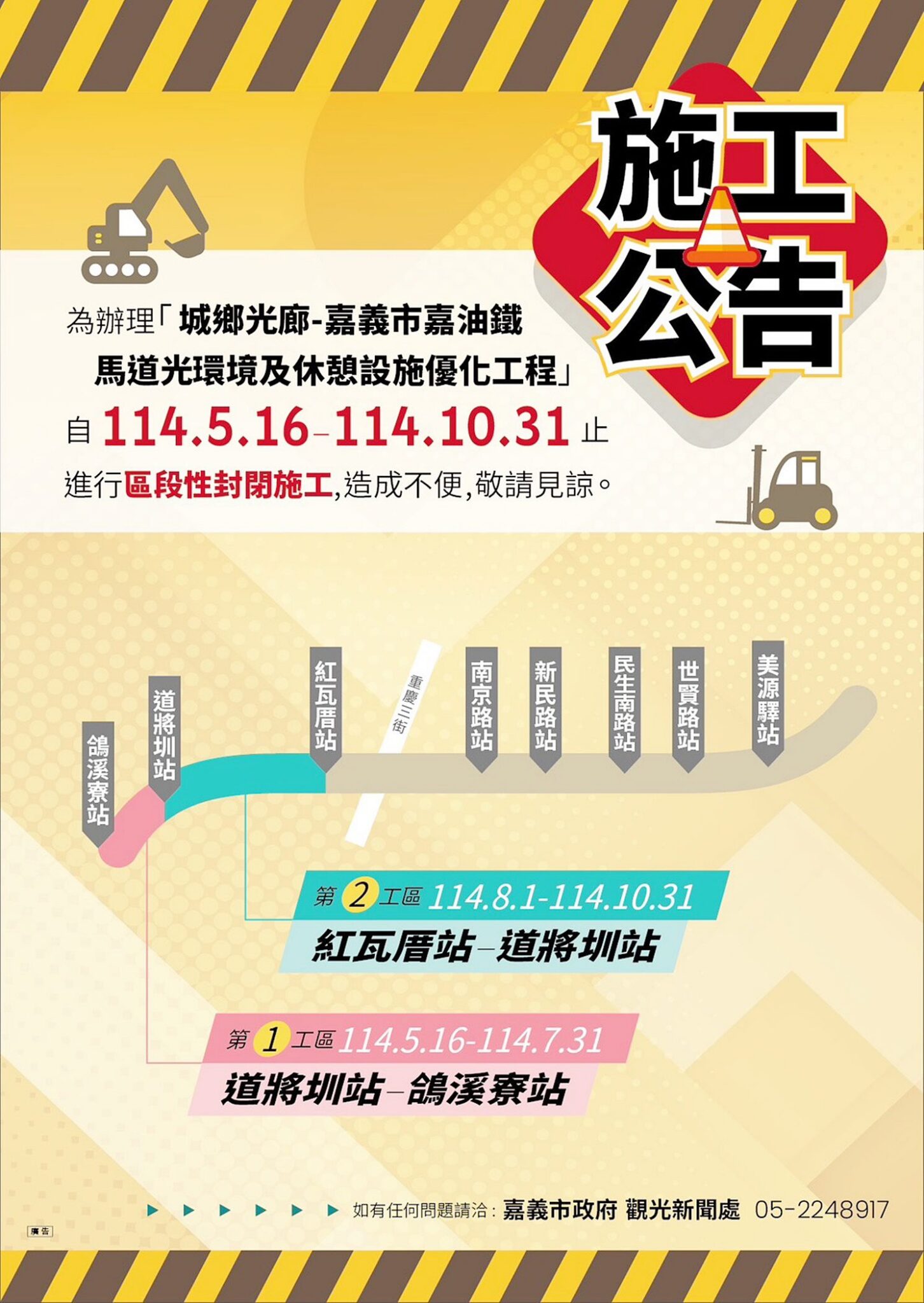 市府觀光新聞處提醒民眾,施工期間難免影響通行,請多予體諒,並將督導廠商如期如質完成工程,讓市民與遊客在今年底一同見證嘉油鐵馬道全面升級後的風采。