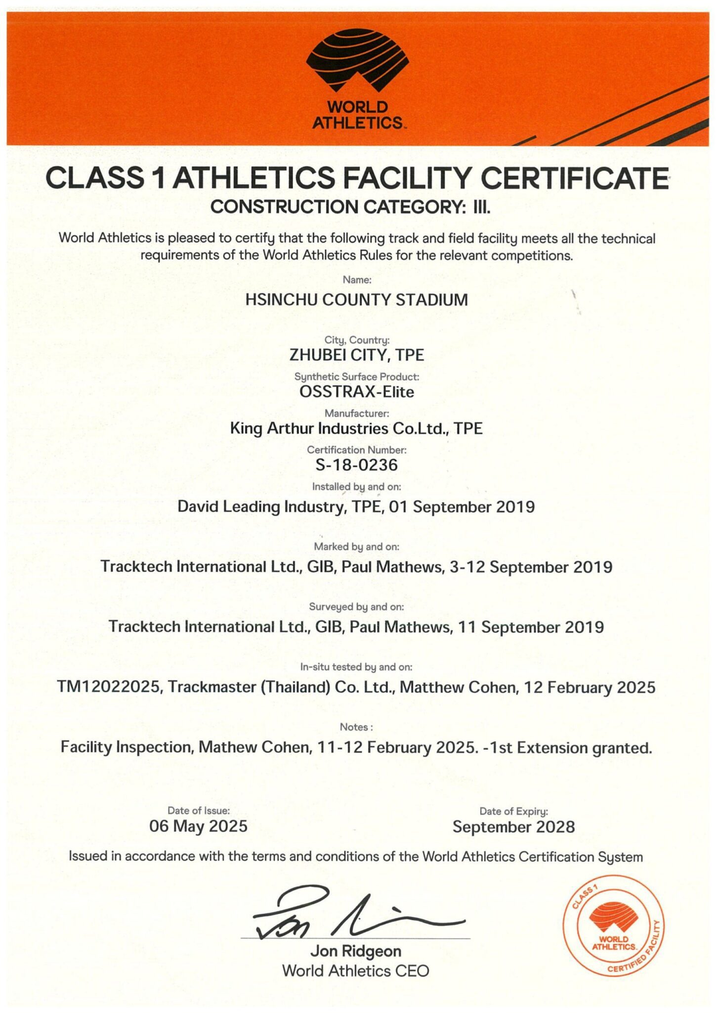 新竹縣體育場田徑場經過國內實驗室場地初測,初測通過後,接續安排國際實驗室測量,相關測量數據良好,終於在114年5月6日再次取得認證,效期至117年9月止。教育局表示,測量過程中,世界田徑總會認可的國外場地測量師對場地維護讚譽有加,直呼「田徑場維護工作做得很好」。