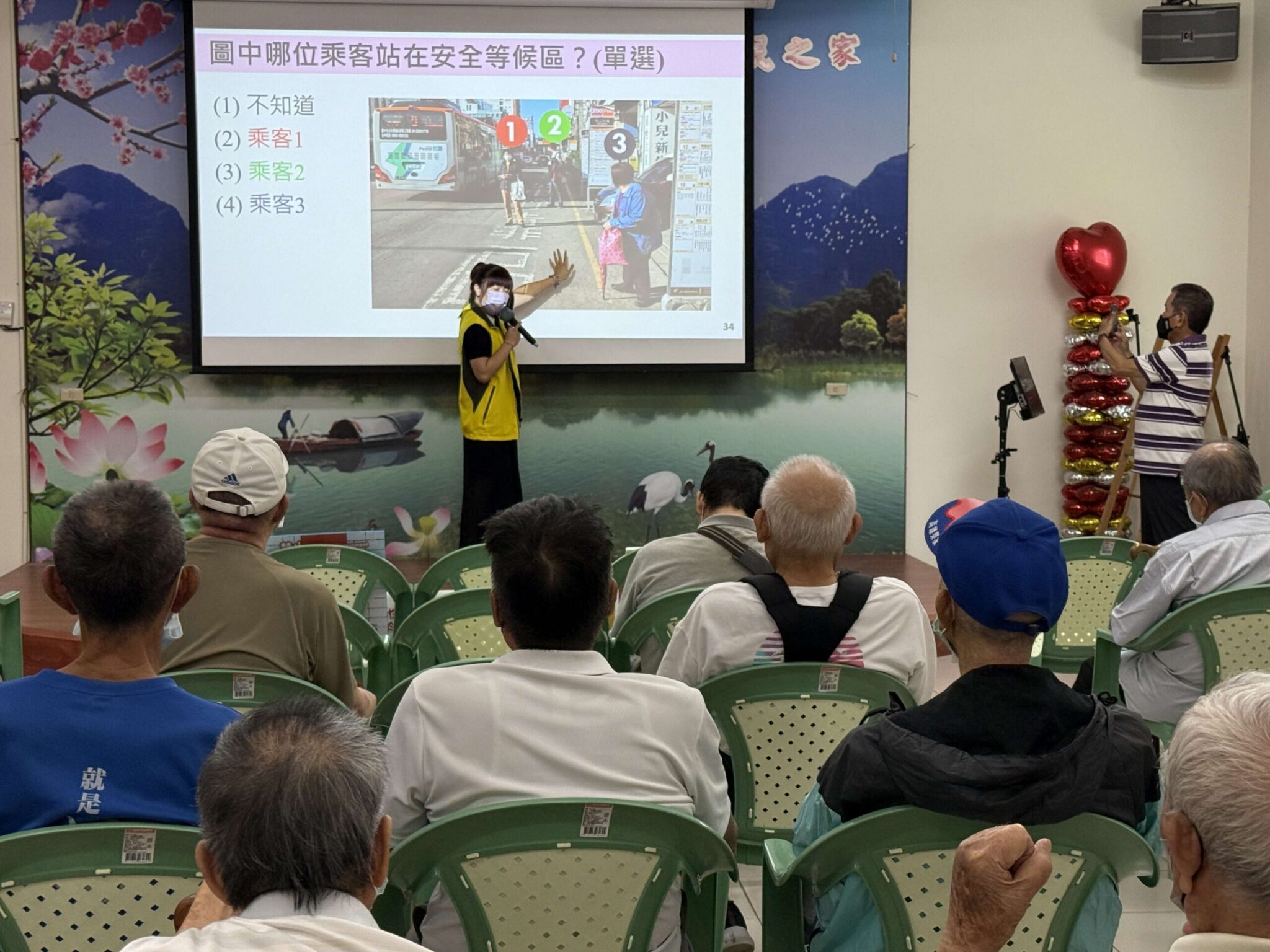 本次交通安全宣導主題以長輩經常搭乘的大眾交通工具-公車為例,提醒長輩們搭乘公車應注意哪些安全細節?搭乘公車時乘客可能會遇到什麼危險?候車時應注意事項有哪些?上車時應注意事項為何?車輛行進中又要注意什麼?路老師與長輩們互動熱絡,長輩們回應聲此起彼落,十分專注且認真。
