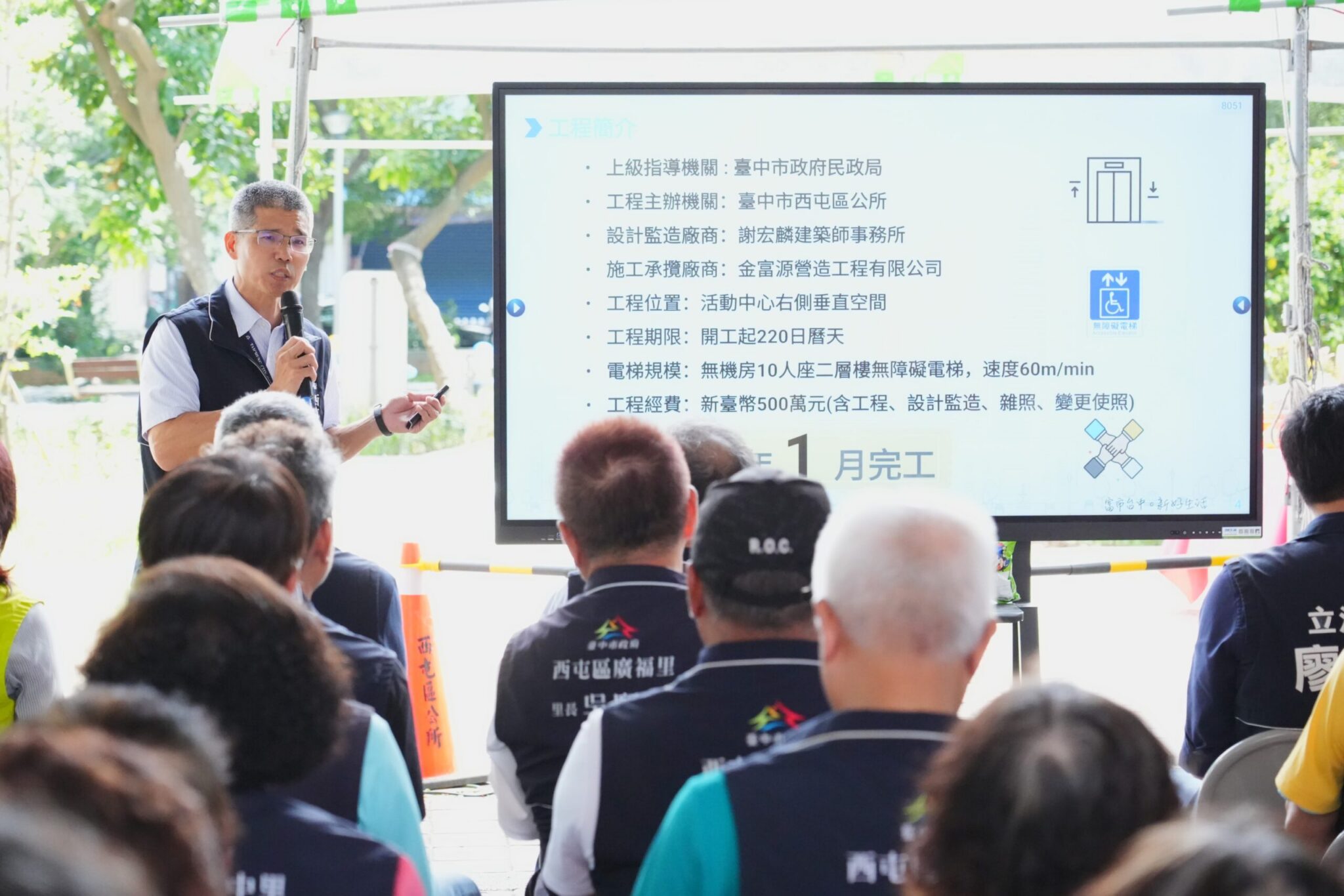西屯區公所說明,市府團隊積極推動西屯區各項建設,除今日電梯增設工程外,還有中央公園內數座國際級指標性的重大建設;包括即將於年底開館的綠美圖、台中國際會展中心,還有明年將對外營運的台中流行影音中心、水湳轉運中心等;交通方面,除有貫穿西屯7個里的捷運綠線,捷運藍線也將在市政府站與捷運綠線交會,橫跨西屯18個里,首標BM01機電標將於6月開工;還有眾所矚目的市政路延伸工程一標已於昨日通車,二標預計115年底完工,紓解地方交通瓶頸。
