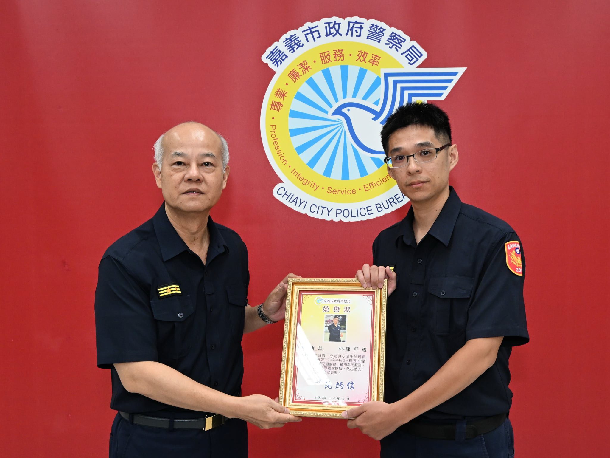 局長沈炳信對於同仁發揮同理心執勤之精神,保護民眾財產安全以及積極為民服務,提出肯定,並期勉本局員警以「民眾的小事就是警察的大事」之精神自我期許,積極為民服務,使民眾感受到警察的用心,讓民眾更安心、更信賴警察,共同營造「全齡共享、世代宜居」安全健康、幸福永續的嘉義市。