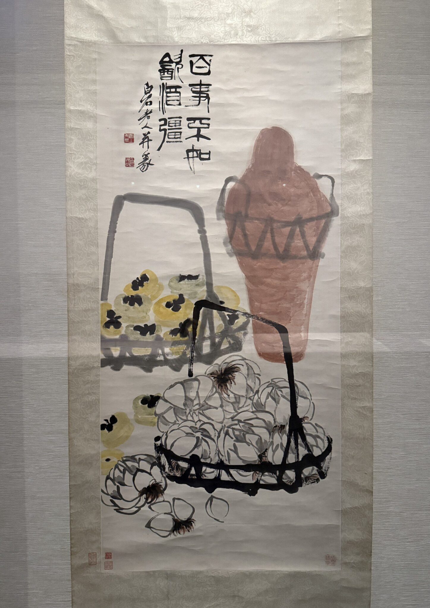 齊白石〈酒柿〉巧妙利用酒罈、百合與柿子取得諧音祝福與畫面的平衡。