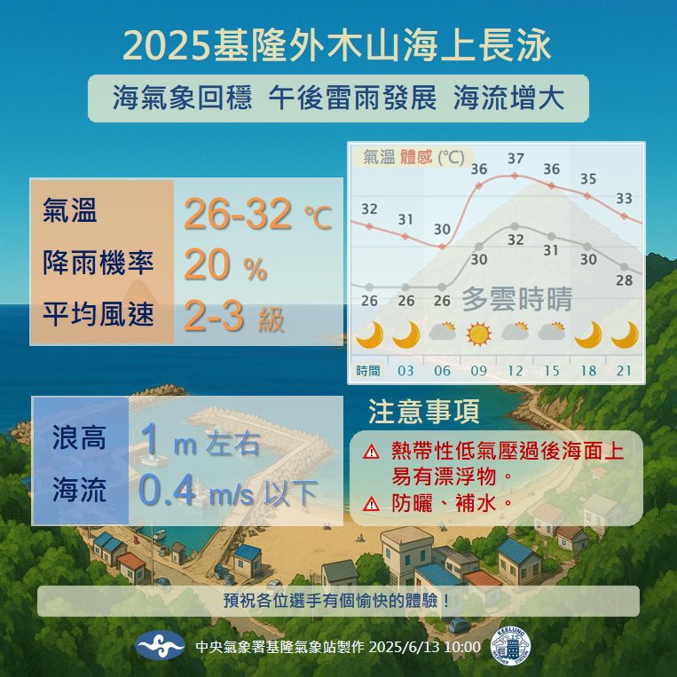 市府強調,熱帶低氣壓 TD02外圍環流帶來降雨,較大影響期間為6/13(五)及6/14(六)兩日,週六仍受一定降雨影響,部分民眾擔心周五、六降雨情形連帶影響活動當日海象不佳等疑慮,市府始終密切關注,依據中央氣象署預報資料顯示,週日活動期間6月15日06:00-12:00,外木山沿岸當日天氣為多雲時晴,氣溫約26度-32度,平均風速約2至3級,各項天候條件相對穩定,將如期舉行外木山海上長泳活動。