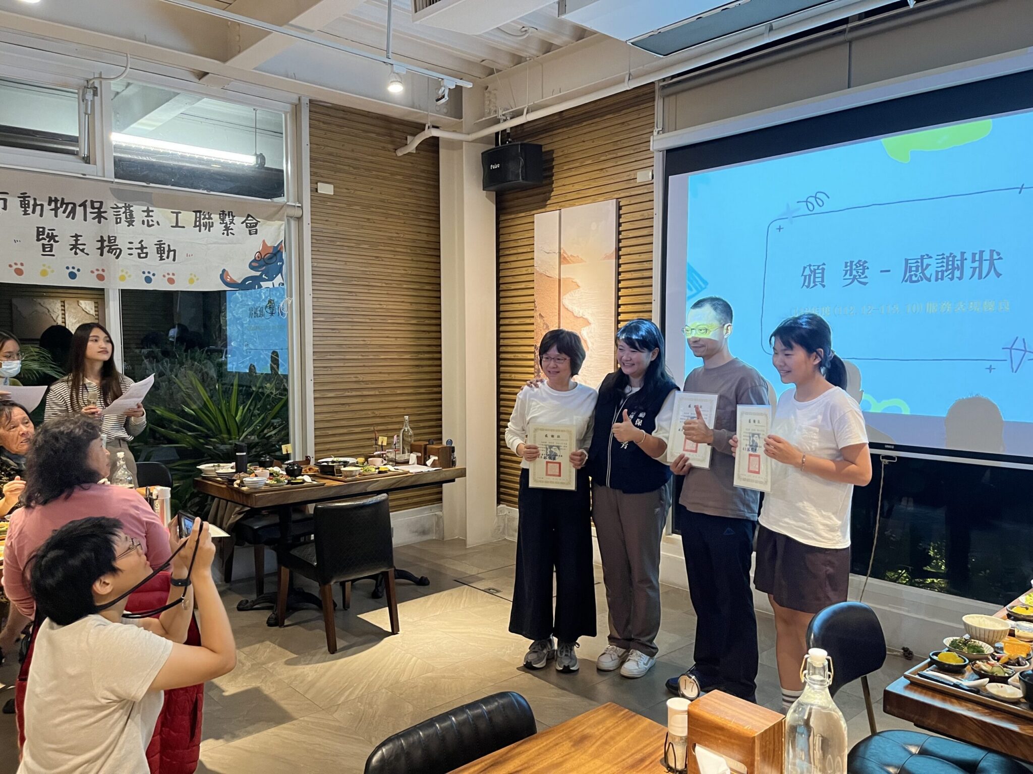 台中市動物保護防疫處於昨(22)日舉辦「113年動物保護志工聯繫會暨期末表揚活動」,感謝志工們一年來的辛勞與付出,特別頒發服務時數前3名菁英獎及感謝狀以表彰志工無私的奉獻與精神,其中3位志工年資滿一年且服務時數破百,獲頒桃紅色背心成為資深志工。