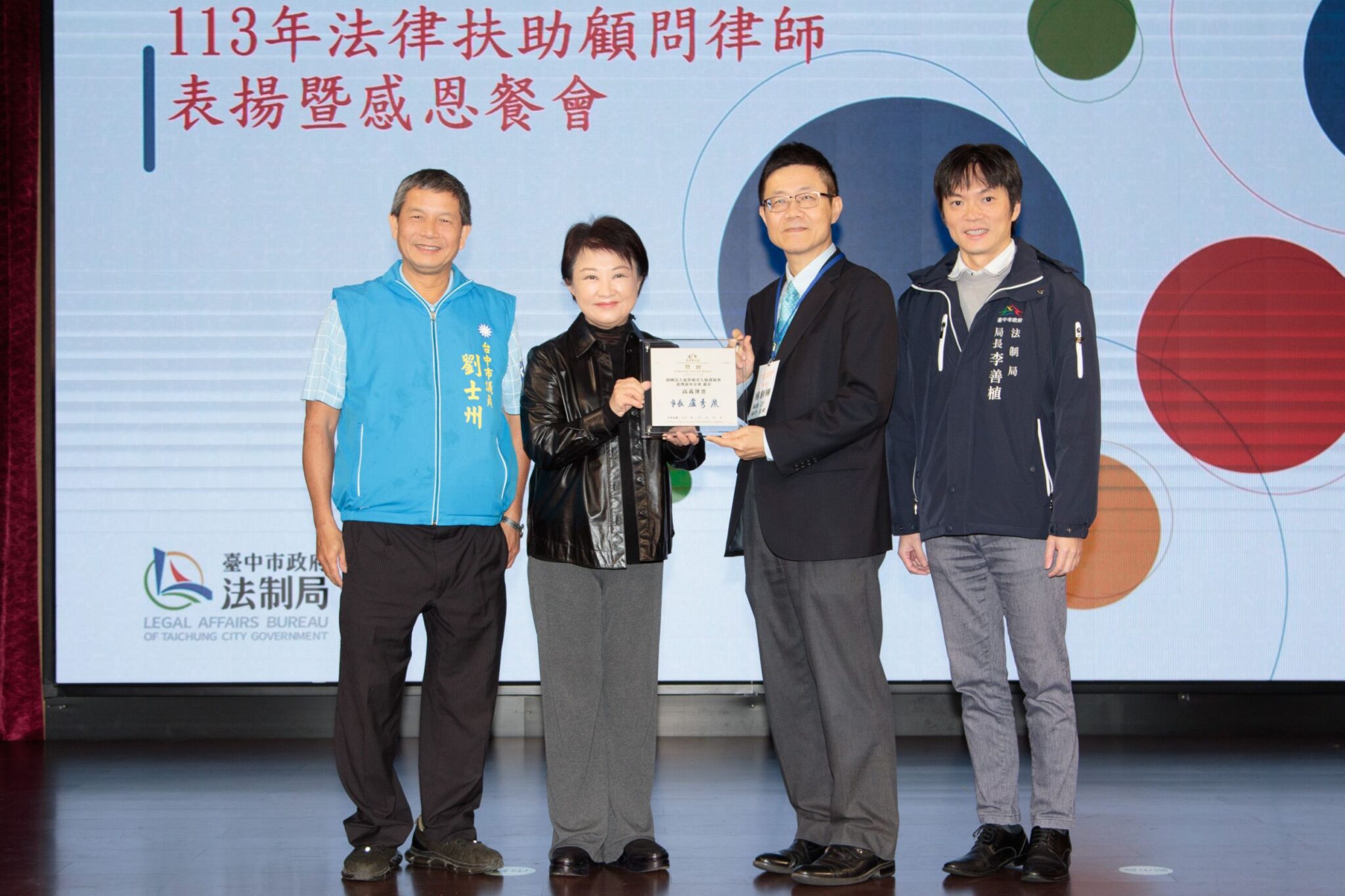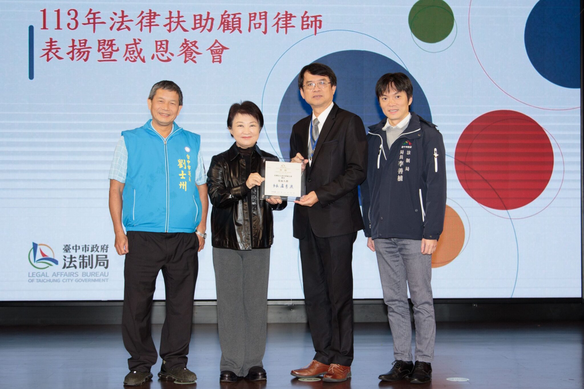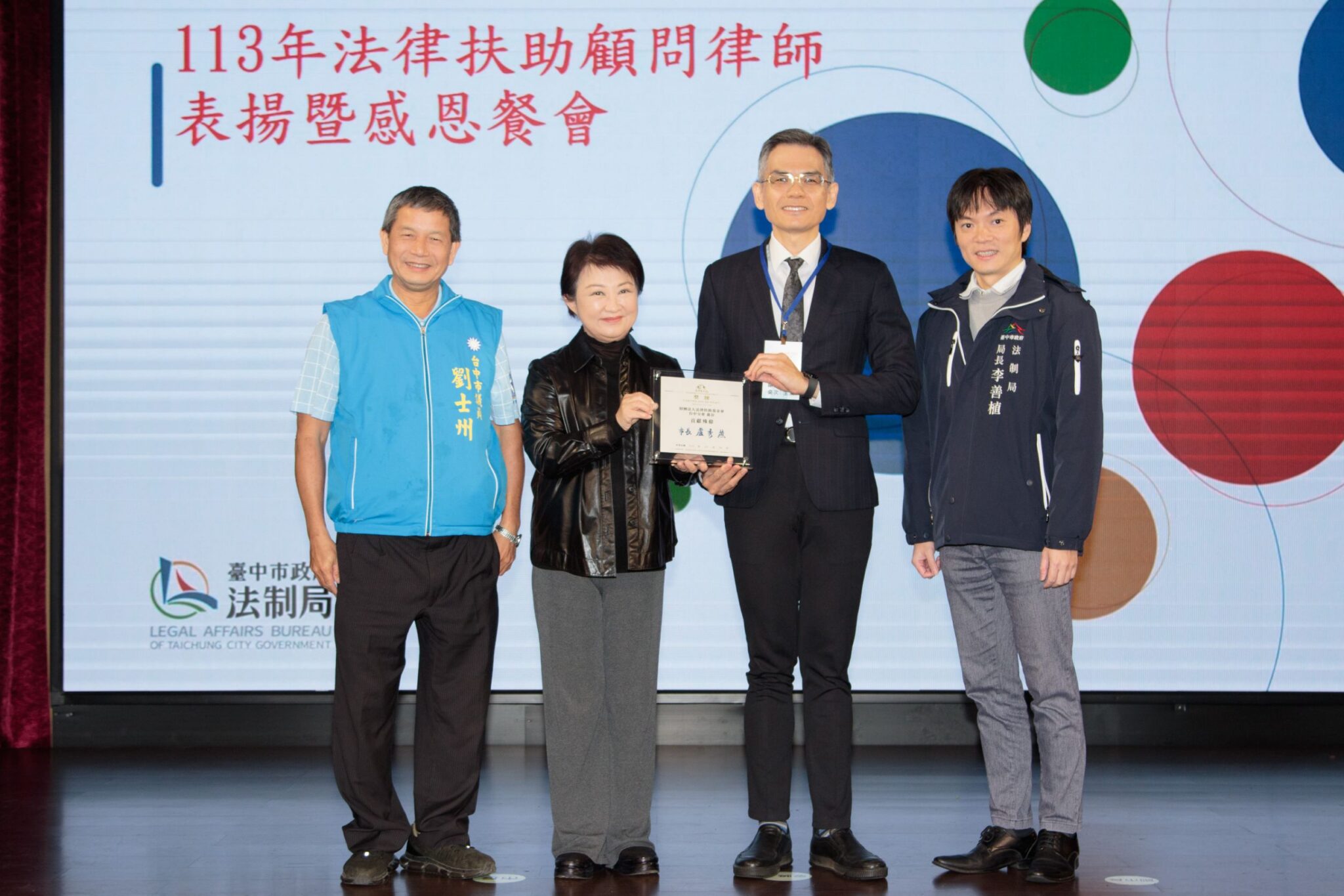 台中市政府法制局今(24)日上午於潮港城舉辦「113年度法律扶助顧問律師表揚大會」,表揚過去一年為市民提供法律諮詢服務的182位法律扶助顧問律師及熱心參與公益的台中律師公會、法扶基金會台中分會、犯保協會台中分會。市長盧秀燕親臨頒發感謝狀及獎牌,感謝律師們長期以來以專業守護市民權益,並展現台中作為友善宜居城市的實力。