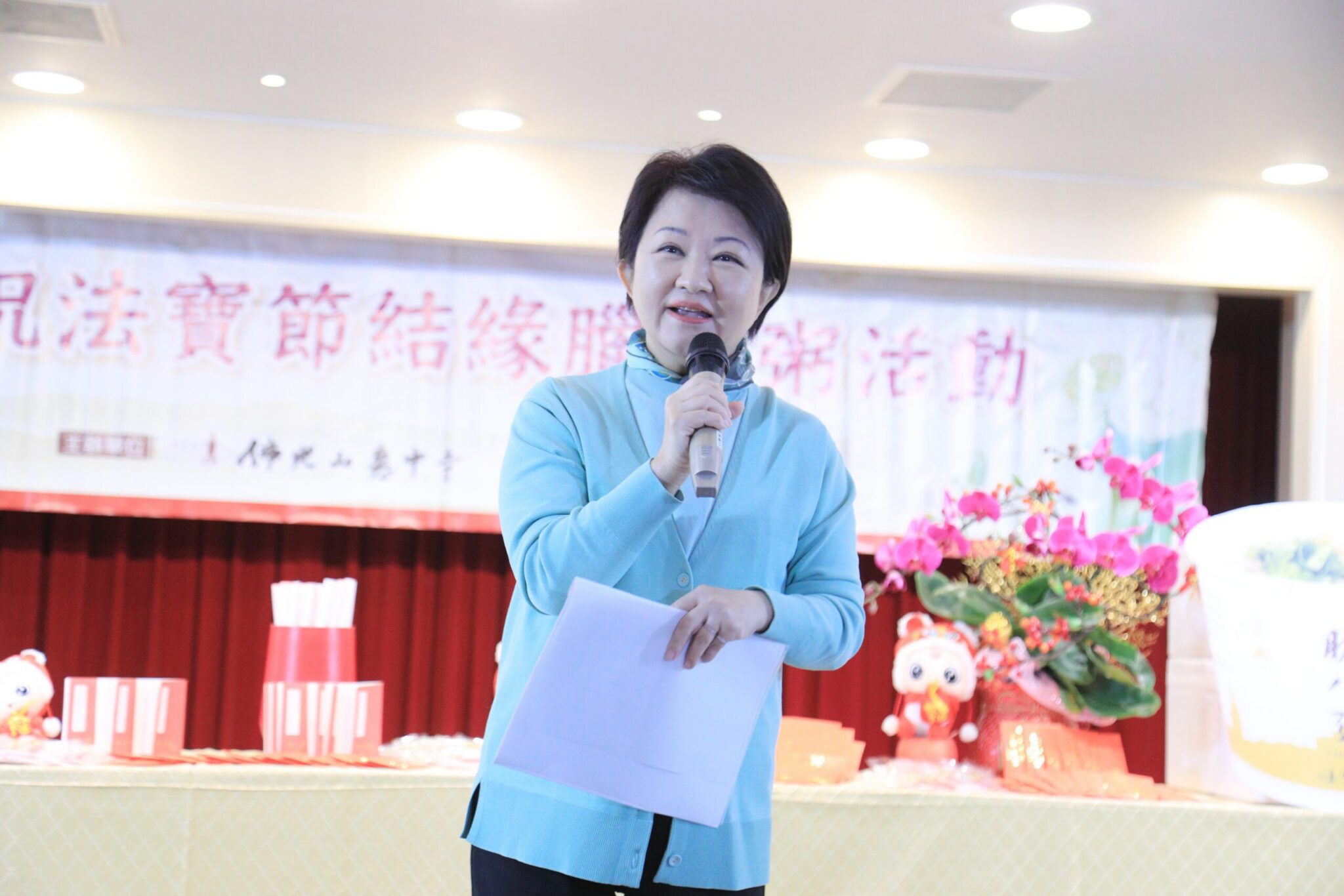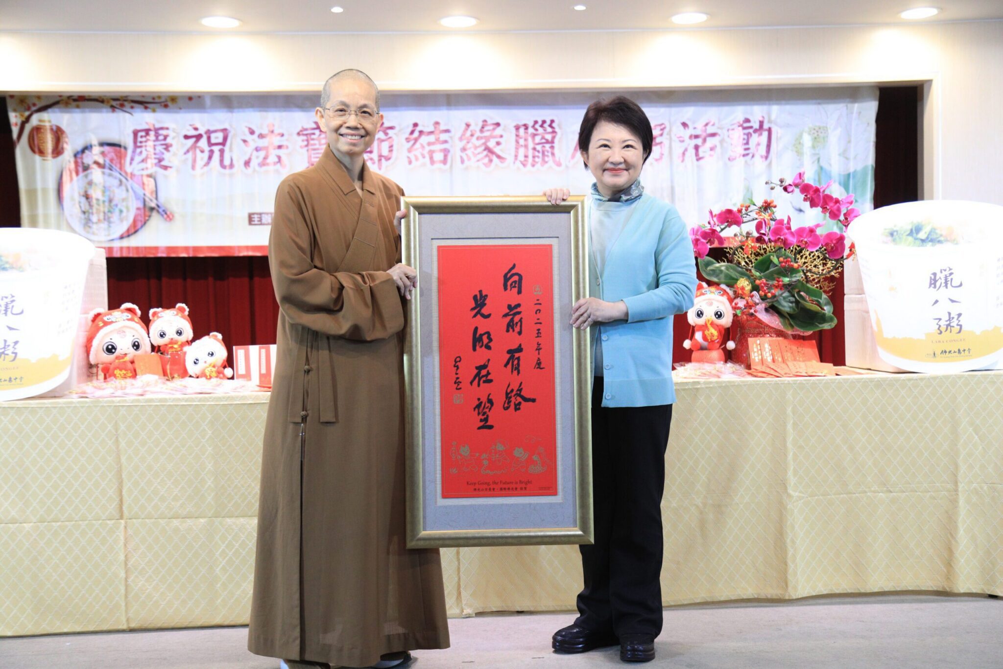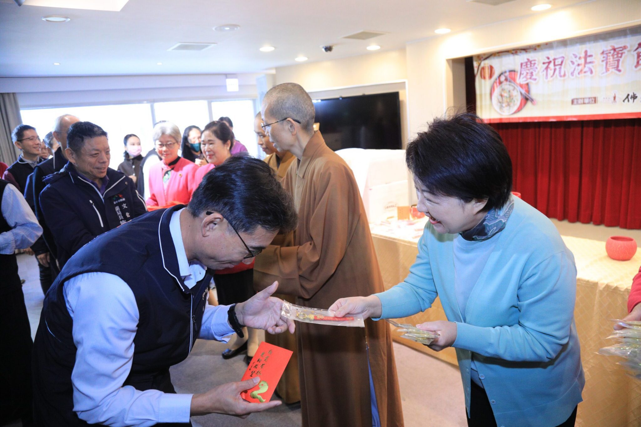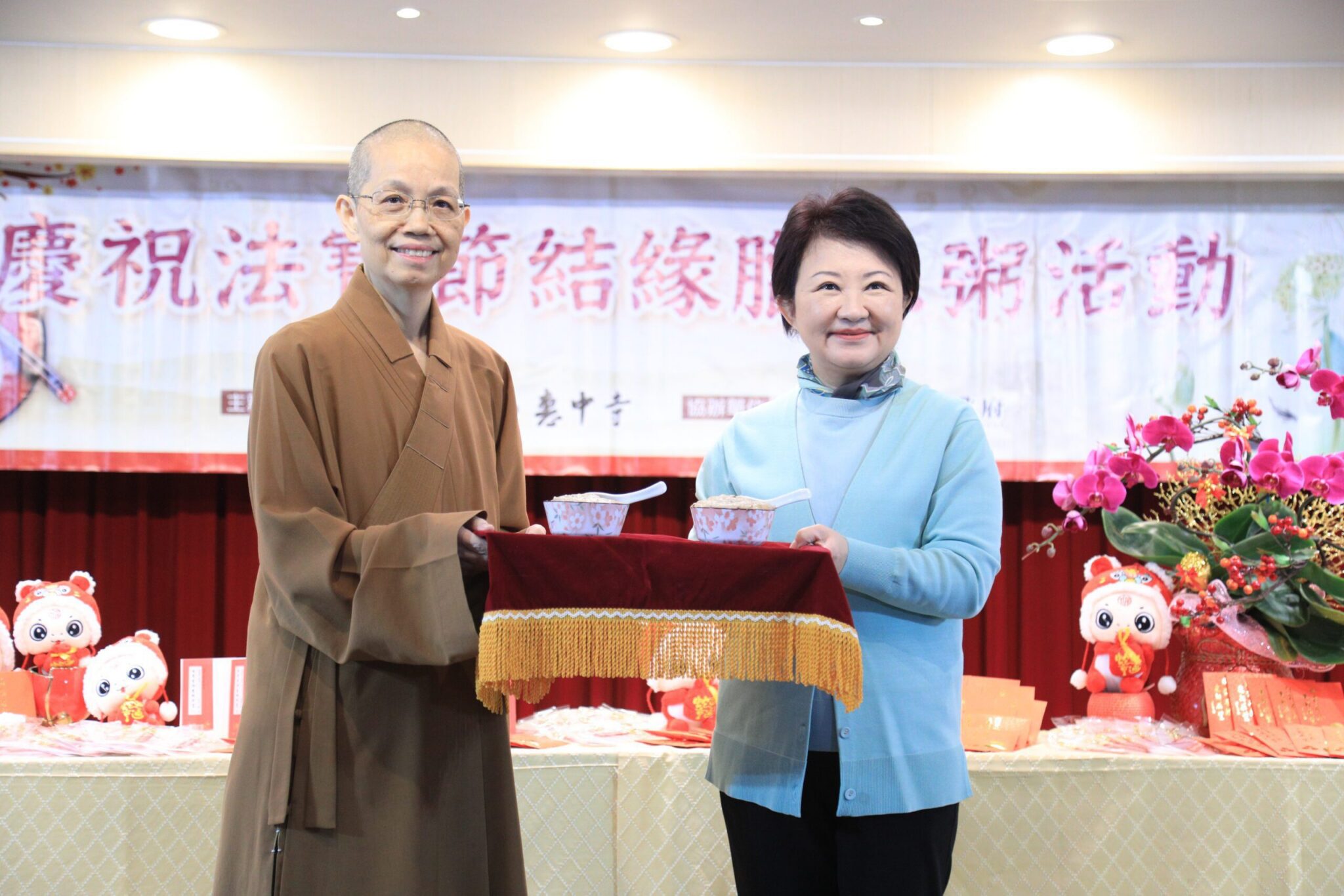 佛光山惠中寺為感謝台中市府團隊長期以來對市政推動的努力,今(7)日上午11時在台灣大道市政大樓惠中樓9樓台中廳舉辦「佛光山惠中寺慶祝法寶節結緣臘八粥活動」贈粥儀式,台中市長盧秀燕、佛光山中區總住持覺居法師與各局處首長到場共襄盛舉,盧市長代表市府感謝寺方準備數千碗美味的臘八粥、春聯及蛇年紅包致贈市府員工,傳遞愛與祝福。