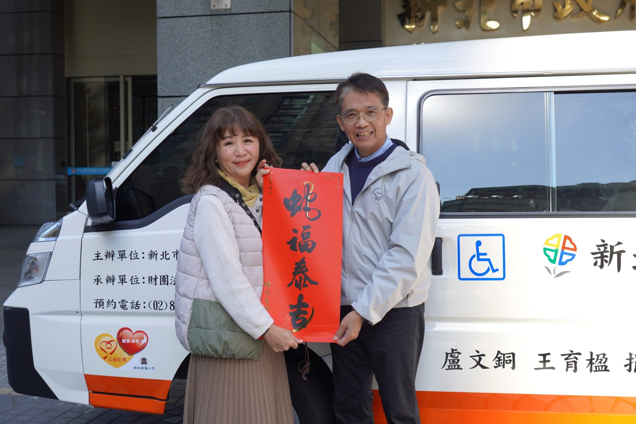 新北市秘書長邱敬斌代表侯友宜市長回贈感謝牌和復康巴士模型車。邱敬斌表示,王女士事業有成之餘,以實際行動傳遞愛心,並將善念影響傳播給同仁,令人敬佩。新北市目前實際投入營運的復康巴士有570輛,服務範圍包含基北北桃,就是希望社會共好,讓更多有需求者更方便叫到車。