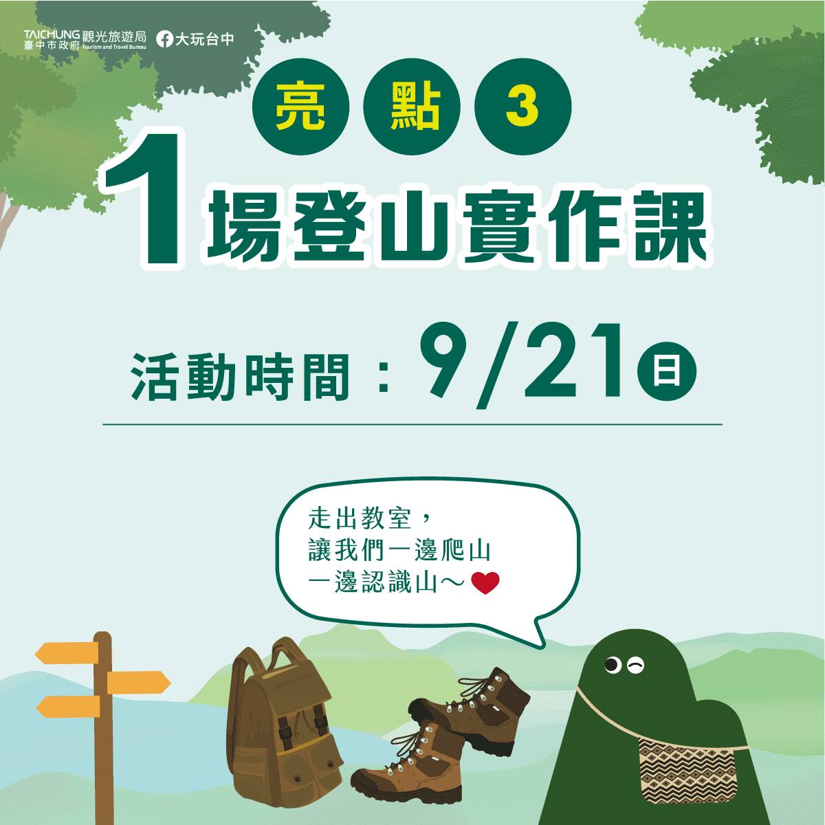 觀旅局再次提醒,攀登步道具有一定難度及風險,出發前務必衡量身體及天候狀況,切勿勉強前行,歡迎全台各地的朋友們前來台中,親身體驗感受豐富的山林資源魅力。活動相關問題請電洽登山推廣小組04-37077218或詢問官方Line帳號:2025嗨刻台中(ID:@344irthb)。更多台中觀光景點及推薦遊程,請上台中觀光旅遊網查詢(https://travel.taichung.gov.tw)。