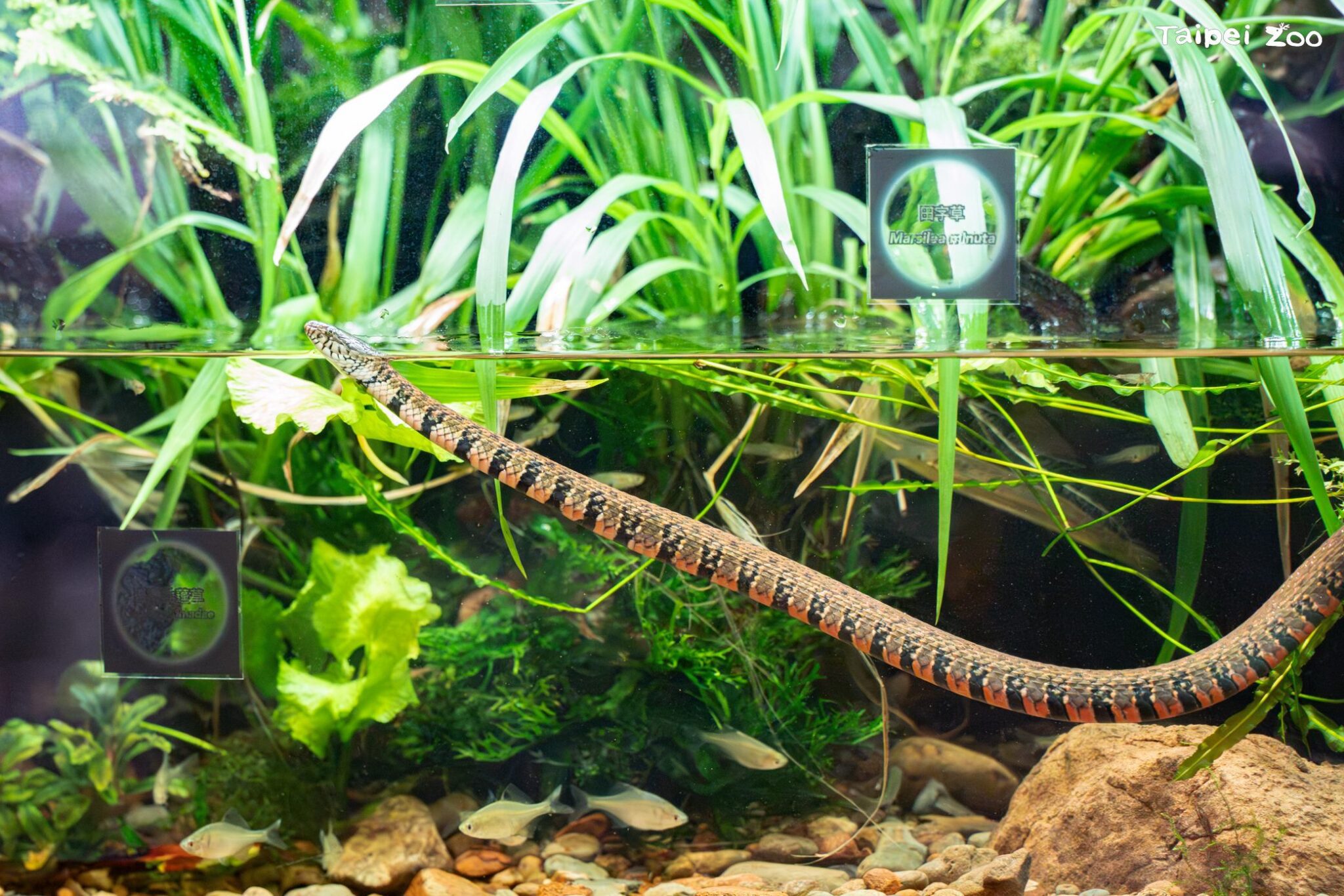 在兩棲爬蟲動物館的臺灣兩棲爬蟲區可以看到最貼近我們生活環境的本土蛇類!例如,生活在灌叢、沼澤地的緬甸蟒、在地面或樹叢間都靈活穿梭的青蛇、喜歡躲在落葉堆裡的百步蛇、偶爾在農墾地現身的眼鏡蛇,還有在水裡悠游自在的赤腹游蛇!