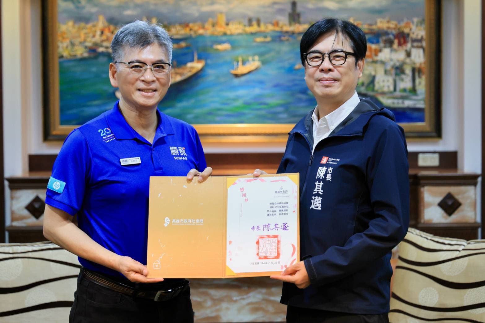 港都科技三三會與順發電腦公司成立的順發公益運動協會,將今年Run for Future公益路跑活動報名費結餘款173萬8,328元全數捐給高雄市17處兒少安置單位,幫助弱勢兒少。市長陳其邁今(21)日出席代表受贈,並頒發感謝狀感謝港都科技三三會、順發電腦公司及順發公益運動協會發揮企業社會責任,共同為弱勢兒少送暖。