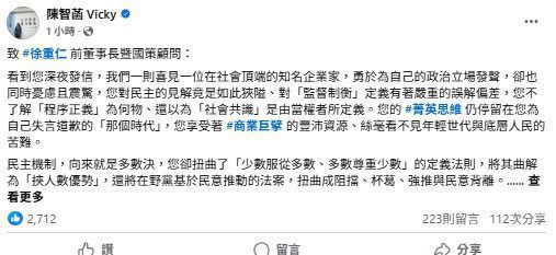 陳智菡21日於臉書發文表示,看到徐重仁深夜發信,一則喜見一位在社會頂端的知名企業家,勇於為其政治立場發聲,卻也同時憂慮且震驚,“您對民主的見解竟是如此狹隘、對‘監督制衡’定義有著嚴重的誤解偏差,您不瞭解‘程序正義’為何物、還以為‘社會共識’是由當權者所定義,您的菁英思維仍停留在為自己失言道歉的那個時代,您享受著商業巨擘的豐沛資源、絲毫看不見年輕世代與底層人民的苦難”。 陳智菡提及,民主機制向來就是多數決,徐重仁卻扭曲“少數服從多數、多數尊重少數”的定義法則,將其曲解為“挾人數優勢”,還將在野黨基於民意推動的法案,扭曲成阻擋、杯葛、強推與民意背離。 陳智菡指出,身為一個台灣社會舉足輕重、身家背景雄厚的企業家,似乎沒有看到民進黨政府如何打壓警消權益、讓警消在不能組織工會的狀況下出生入死,還把警消組工會說成是配合中共政權、要消滅台灣的行徑;徐重仁似乎也沒有看到外送員如何在颳風下雨、交通繁忙的車陣裡冒死穿梭,卻毫無基本職安保障,而執政黨則一再怠惰拒絕修法,“您(徐重仁)更選擇性的忽視民進黨修惡收回7天假之後,台灣人工時與血汗勞動與日俱增的慘況,還假於民就是在野黨為人民爭取勞動人權,不再遭受少數資本家剝削掠奪、淪為苦勞。”法庭直播、虐童致死加重其刑,都是迫切的民意與社會共識,都是人民對程序正義的追求,“別再有錢判生,沒錢判死,當然我知道您沒有這個煩惱”。 ![]() 陳智菡說,是誰癱瘓了政府施政?請去災區看看沒水沒電長達10天的災民們的怒吼與苦難;誰動搖了整體社會的安定?請看看多少“共諜”潛伏在民進黨中央與高層,卻不知反求諸己、負起政治責任,還在傾全黨之力砸人民納稅錢搞大罷免、製造人民之間的撕裂對立,“身為一個在台灣長期經營的知名企業,您對於時局的憂心非常合理,只是可惜了,身為一個應該有宏觀格局的企業家,您根本完全搞錯了方向,民主體制的長治久安需要靠執政黨與在野黨的共同努力,尊重現有的民主體制、服從選舉的結果,而非選輸就翻桌。”民主政治的根本更在於可責性,政治人物必須對選民與其施政負責,現在的執政黨叫民進黨。 陳智菡稱,民主的價值在於一人一票,在於尊重制度與多元、更在“與時俱進”,可惜徐重仁公開支持大罷免的言論,與其在2017年4月11日新書發表會上被問到青年低薪問題時,回覆“現在年輕人太會花錢⋯如果現在沒有那麼多的錢,就應該少花一點”、鼓勵年輕人“不要太計較薪水比別人低,好好工作有一天老闆會看到”的言論一樣,沒有多大的長進。 “您還停留在‘那個世代’的菁英思維,未見一個社會企業家的經營者格局。”陳智菡強調,台灣是民主社會,徐重仁可以停留在“那個時代”,停留在當權者與菁英的舒適圈,人民會自己在7月26日做出選擇,畢竟家財萬貫的大老闆、國策顧問和苦背房貸的年輕人也都衹有一票。 |